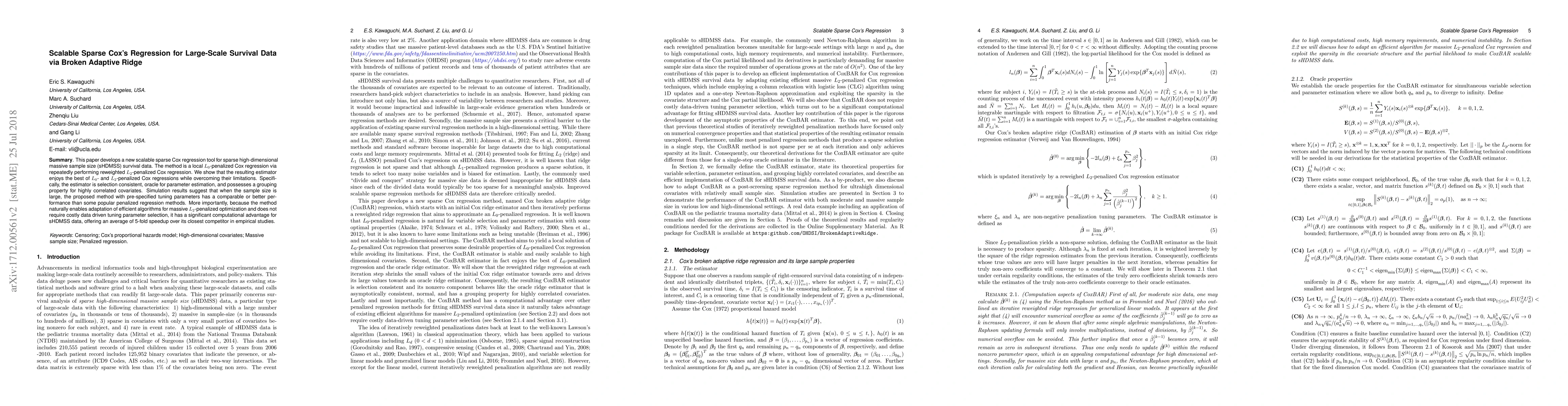This paper introduces a scalable sparse Cox regression method for large-scale survival data, combining $L_0$ and $L_2$ penalties to achieve selection consistency and oracle properties. It demonstrates significant computational efficiency, offering a 5-fold speedup compared to competitors.