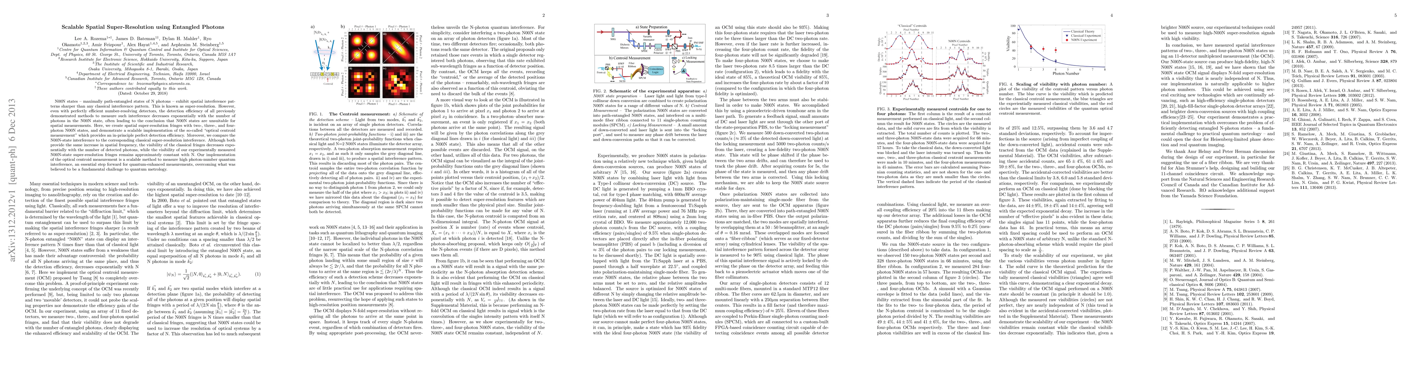 This paper demonstrates scalable spatial super-resolution using N00N states of entangled photons, achieving constant visibility of super-resolution fringes with increasing photon numbers. The optical centroid measurement method provides perfect detection efficiency, overcoming the exponential efficiency drop seen in classical methods.