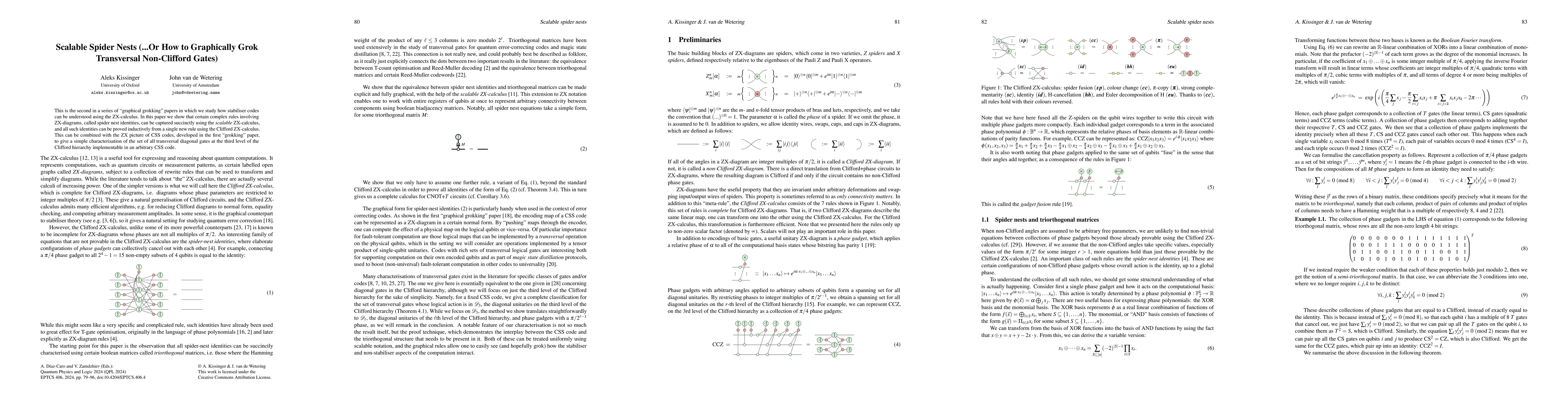 This paper demonstrates how the scalable ZX calculus can succinctly capture complex spider nest identities in stabiliser codes, proving these identities inductively from a single new rule. It provides a straightforward characterisation of transversal diagonal gates in the third level of the Clifford hierarchy for arbitrary CSS codes.