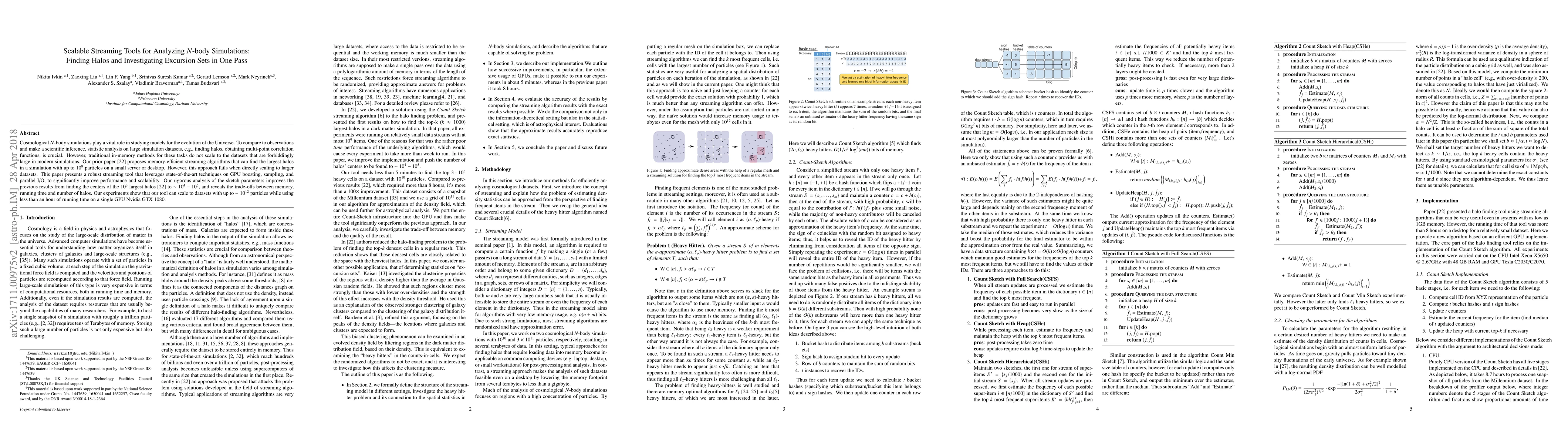 Cosmological $N$-body simulations play a vital role in studying models for the evolution of the Universe. To compare to observations and make a scientific inference, statistic analysis on large simulation datasets, e.g., finding halos, obtaining multi-point correlation functions, is crucial. However, traditional in-memory methods for these tasks do not scale to the datasets that are forbiddingly large in modern simulations. Our prior paper proposes memory-efficient streaming algorithms that can find the largest halos in a simulation with up to $10^9$ particles on a small server or desktop. However, this approach fails when directly scaling to larger datasets. This paper presents a robust streaming tool that leverages state-of-the-art techniques on GPU boosting, sampling, and parallel I/O, to significantly improve performance and scalability. Our rigorous analysis of the sketch parameters improves the previous results from finding the centers of the $10^3$ largest halos to $\sim 10^4-10^5$, and reveals the trade-offs between memory, running time and number of halos. Our experiments show that our tool can scale to datasets with up to $\sim 10^{12}$ particles while using less than an hour of running time on a single GPU Nvidia GTX 1080.