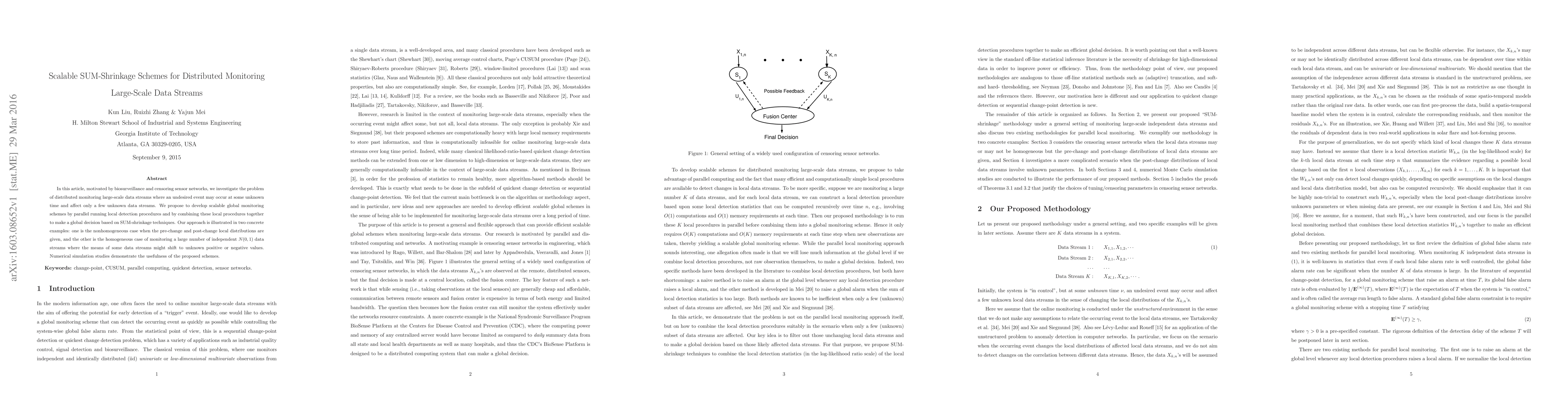 This paper proposes scalable global monitoring schemes for distributed large-scale data streams using SUM-shrinkage techniques. It employs parallel local detection and combines them for global decisions, illustrated through nonhomogeneous and homogeneous data stream examples, with simulations validating the effectiveness of the approach.