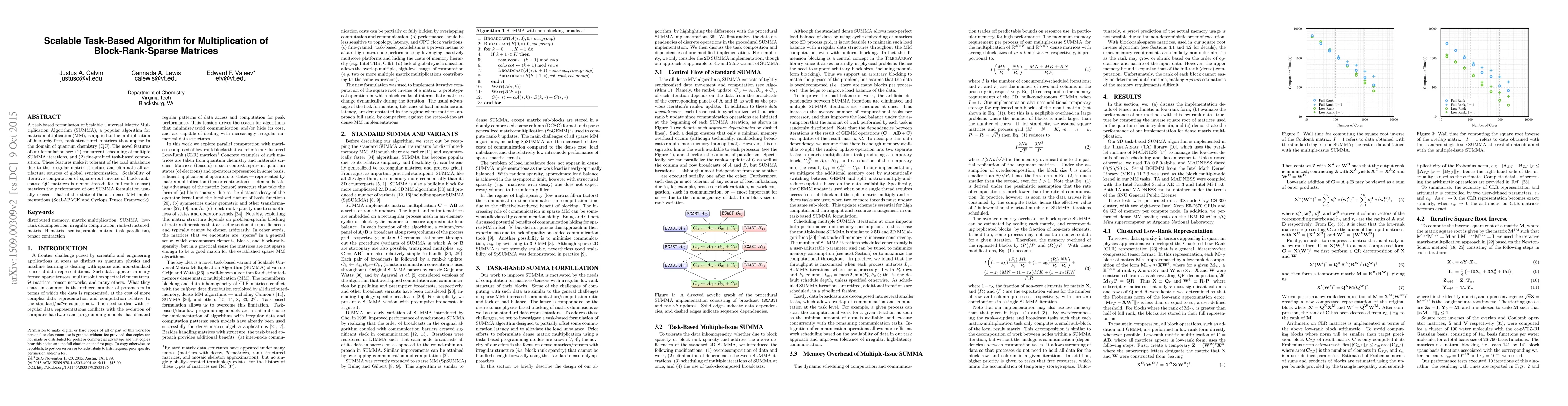 A task-based formulation of Scalable Universal Matrix Multiplication Algorithm (SUMMA), a popular algorithm for matrix multiplication (MM), is applied to the multiplication of hierarchy-free, rank-structured matrices that appear in the domain of quantum chemistry (QC). The novel features of our formulation are: (1) concurrent scheduling of multiple SUMMA iterations, and (2) fine-grained task-based composition. These features make it tolerant of the load imbalance due to the irregular matrix structure and eliminate all artifactual sources of global synchronization.Scalability of iterative computation of square-root inverse of block-rank-sparse QC matrices is demonstrated; for full-rank (dense) matrices the performance of our SUMMA formulation usually exceeds that of the state-of-the-art dense MM implementations (ScaLAPACK and Cyclops Tensor Framework).