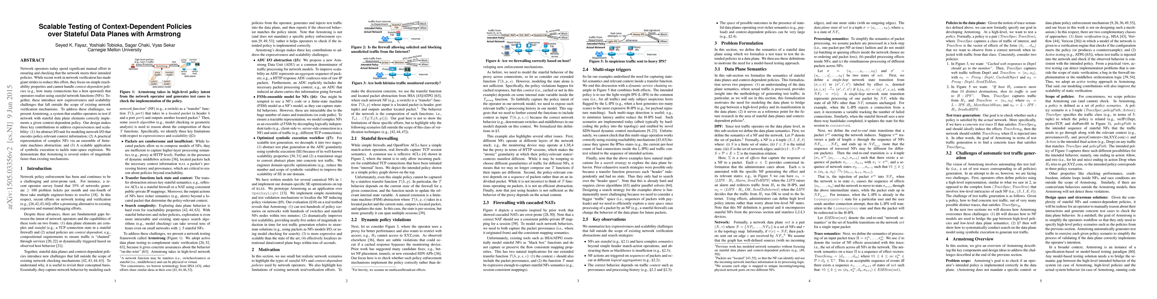 Armstrong is a system designed to test context-dependent policies over stateful data planes, addressing scalability and expressiveness challenges in network verification. It employs an abstract I/O unit, finite state machine abstraction, and symbolic execution to efficiently validate complex network functions.