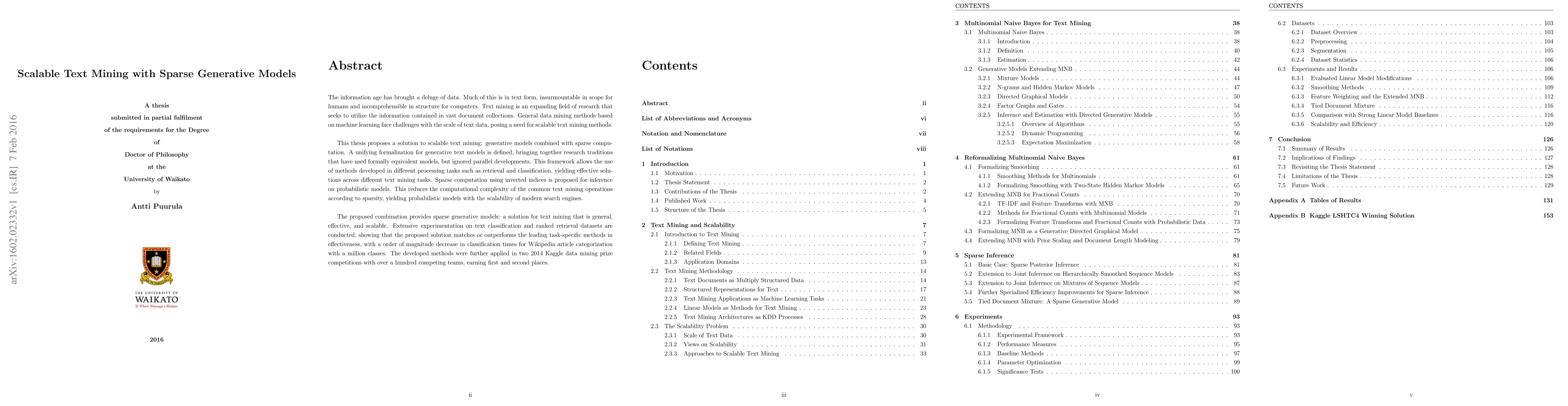 The paper introduces a unifying framework for generative text models, incorporating sparse computation via inverted indices for efficient inference, and extends Multinomial Naive Bayes with prior scaling and document length modeling.