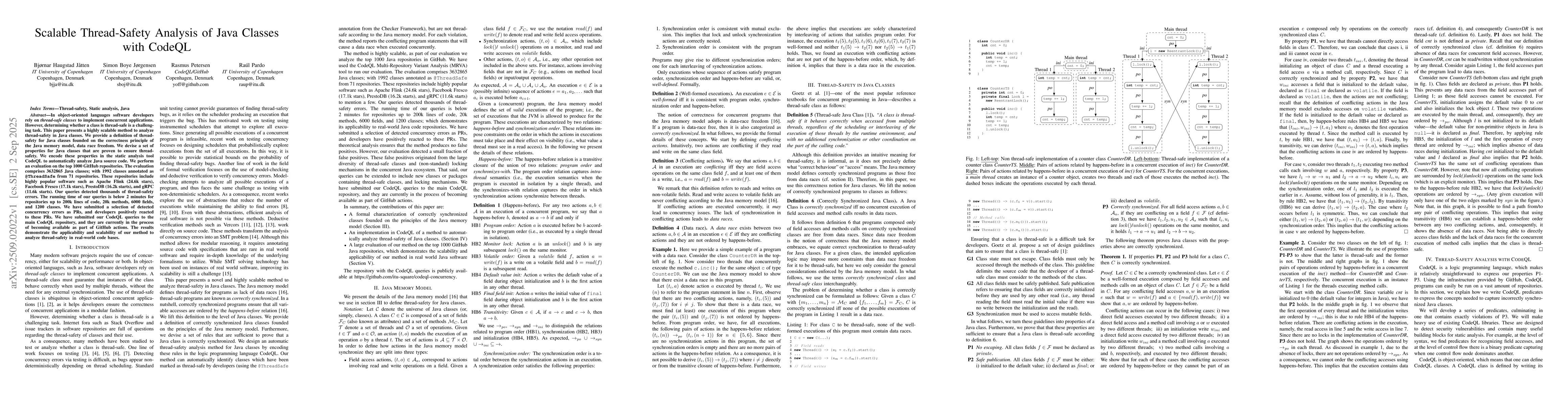 In object-oriented languages software developers rely on thread-safe classes to implement concurrent applications. However, determining whether a class is thread-safe is a challenging task. This paper presents a highly scalable method to analyze thread-safety in Java classes. We provide a definition of thread-safety for Java classes founded on the correctness principle of the Java memory model, data race freedom. We devise a set of properties for Java classes that are proven to ensure thread-safety. We encode these properties in the static analysis tool CodeQL to automatically analyze Java source code. We perform an evaluation on the top 1000 GitHub repositories. The evaluation comprises 3632865 Java classes; with 1992 classes annotated as @ThreadSafe from 71 repositories. These repositories include highly popular software such as Apache Flink (24.6k stars), Facebook Fresco (17.1k stars), PrestoDB (16.2k starts), and gRPC (11.6k starts). Our queries detected thousands of thread-safety errors. The running time of our queries is below 2 minutes for repositories up to 200k lines of code, 20k methods, 6000 fields, and 1200 classes. We have submitted a selection of detected concurrency errors as PRs, and developers positively reacted to these PRs. We have submitted our CodeQL queries to the main CodeQL repository, and they are currently in the process of becoming available as part of GitHub actions. The results demonstrate the applicability and scalability of our method to analyze thread-safety in real-world code bases.