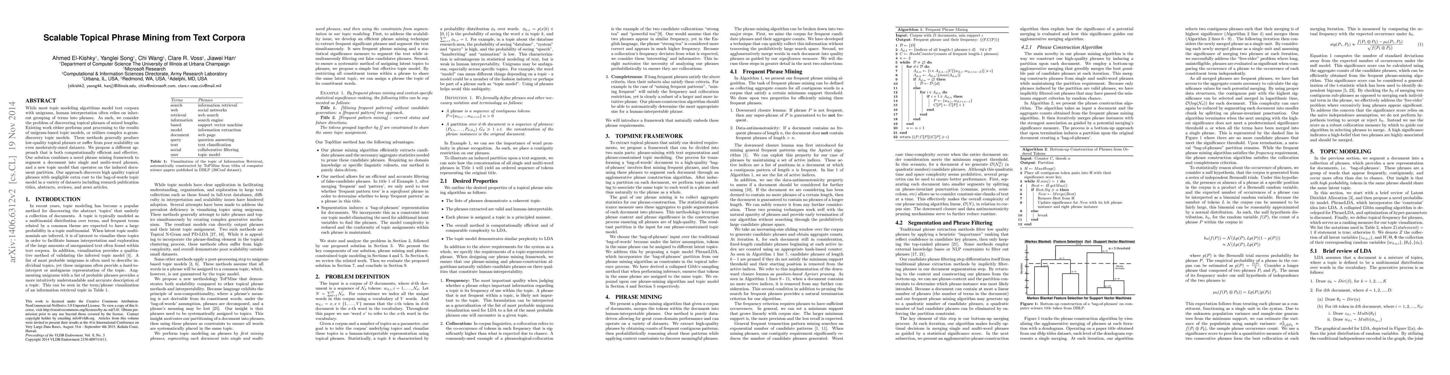 This paper proposes a scalable method for mining topical phrases of mixed lengths from text corpora, addressing the limitations of existing unigram-based and n-gram-based topic models. The approach combines a novel phrase mining framework with a new topic model, achieving high-quality phrase discovery with minimal additional computational cost.