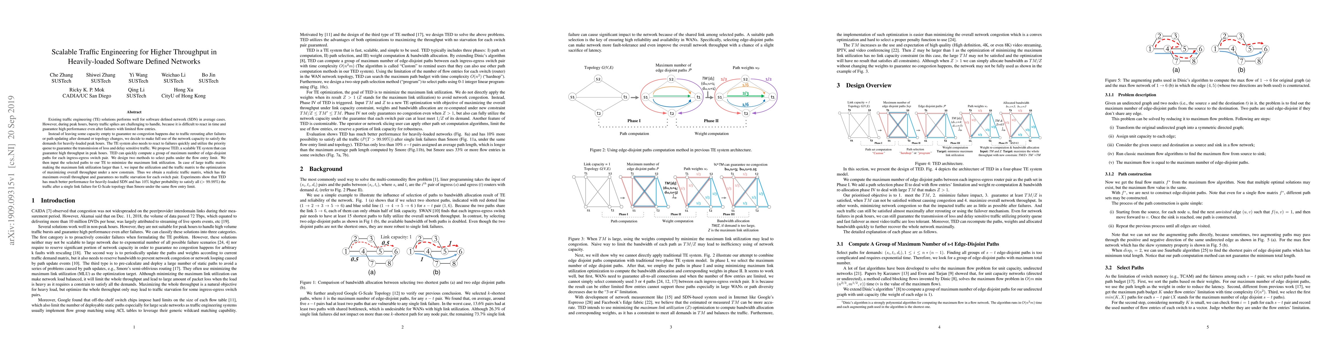 This paper proposes TED, a scalable traffic engineering system for software defined networks, designed to handle peak traffic loads and failures efficiently. TED computes maximum edge-disjoint paths and optimizes link utilization to ensure high throughput and no traffic starvation, demonstrating a 10% higher success rate in satisfying traffic demands after a single link failure compared to Smore.