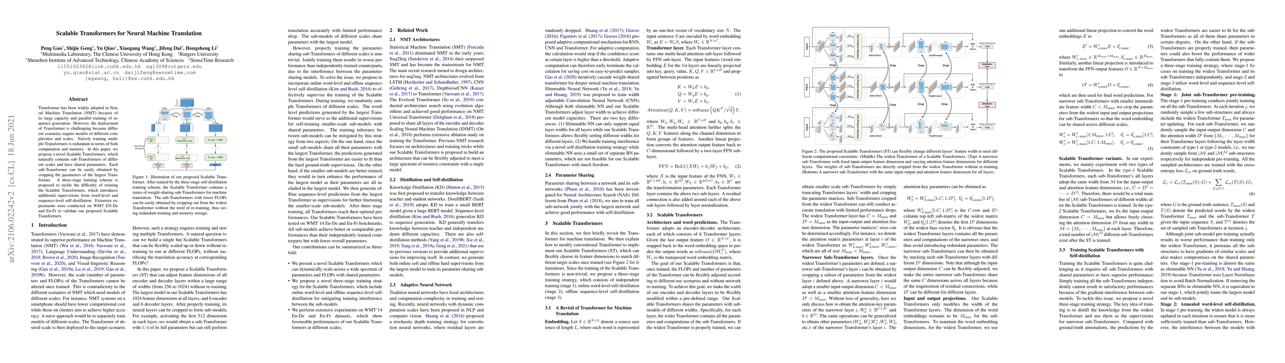 This paper proposes Scalable Transformers for efficient Neural Machine Translation, which contain sub-Transformers of varying scales sharing parameters. A three-stage training scheme with self-distillation is introduced, validated through experiments on WMT EN-De and En-Fr.