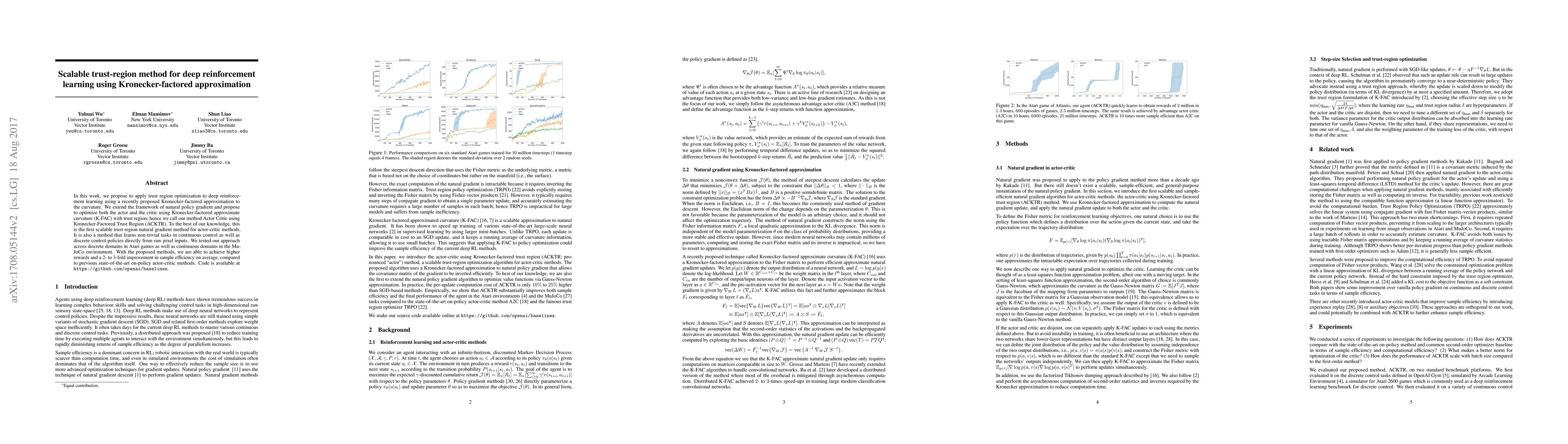 This paper introduces ACKTR, a scalable trust-region method for deep reinforcement learning using Kronecker-factored approximation for curvature. The method optimizes both actor and critic networks, achieving higher rewards and significantly improved sample efficiency compared to previous methods.