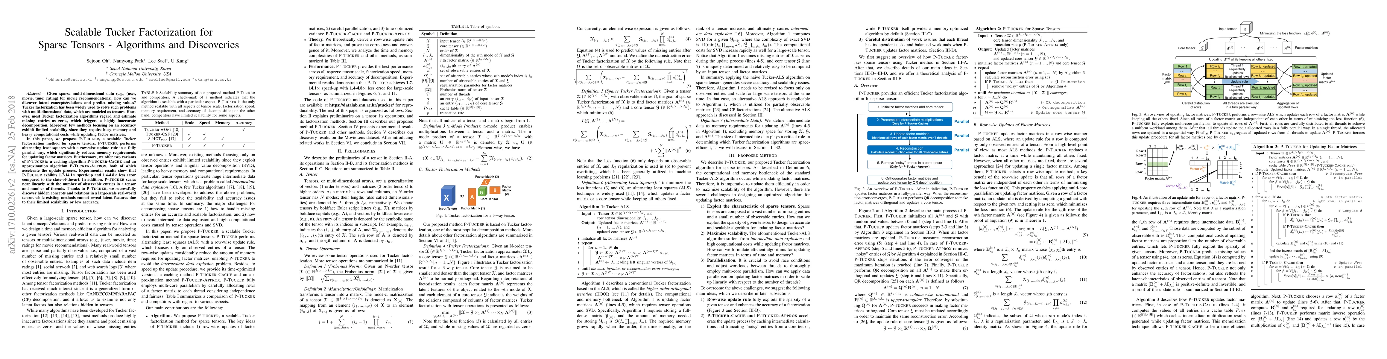 This paper introduces P-Tucker, a scalable Tucker factorization method for sparse tensors, which significantly reduces memory requirements and computational costs through parallel alternating least squares and caching/approximation techniques. Experimental results show P-Tucker achieves substantial speed-up and lower error compared to state-of-the-art methods, enabling the discovery of latent concepts in large-scale tensors.