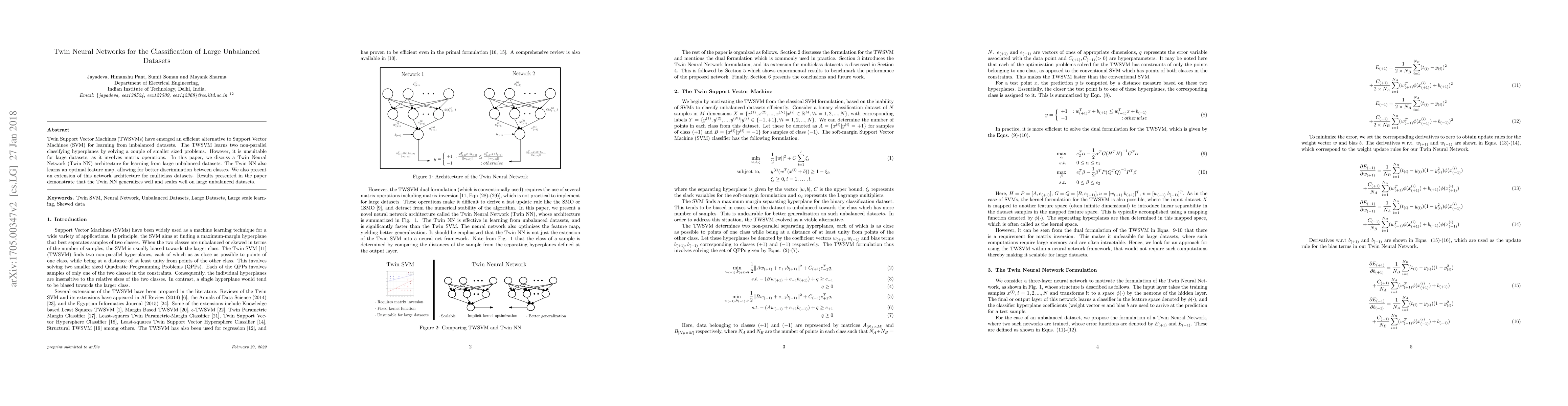 Twin Support Vector Machines (TWSVMs) have emerged an efficient alternative to Support Vector Machines (SVM) for learning from imbalanced datasets. The TWSVM learns two non-parallel classifying hyperplanes by solving a couple of smaller sized problems. However, it is unsuitable for large datasets, as it involves matrix operations. In this paper, we discuss a Twin Neural Network (Twin NN) architecture for learning from large unbalanced datasets. The Twin NN also learns an optimal feature map, allowing for better discrimination between classes. We also present an extension of this network architecture for multiclass datasets. Results presented in the paper demonstrate that the Twin NN generalizes well and scales well on large unbalanced datasets.