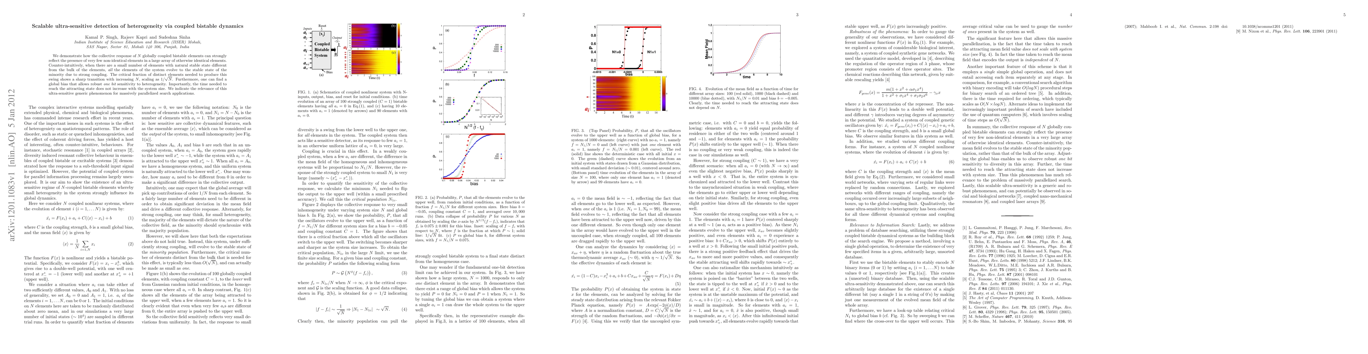 We demonstrate how the collective response of $N$ globally coupled bistable elements can strongly reflect the presence of very few non-identical elements in a large array of otherwise identical elements. Counter-intuitively, when there are a small number of elements with natural stable state different from the bulk of the elements, {\em all} the elements of the system evolve to the stable state of the minority due to strong coupling. The critical fraction of distinct elements needed to produce this swing shows a sharp transition with increasing $N$, scaling as $1/\sqrt{N}$. Furthermore, one can find a global bias that allows robust {\em one bit} sensitivity to heterogeneity. Importantly, the time needed to reach the attracting state does not increase with the system size. We indicate the relevance of this ultra-sensitive generic phenomenon for massively parallelized search applications.