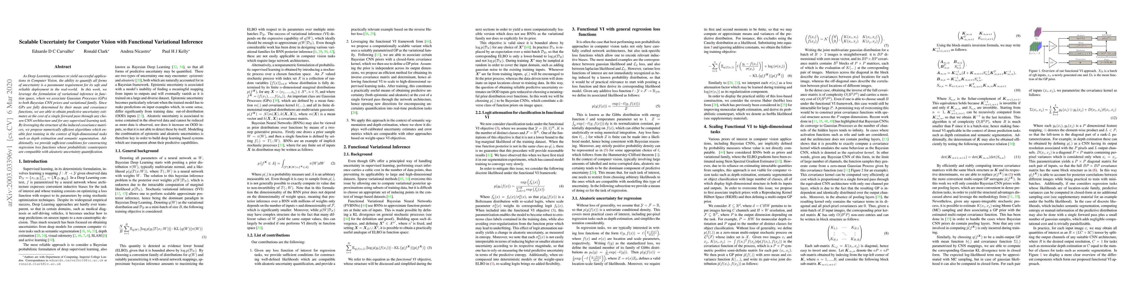 This paper proposes a scalable method for quantifying uncertainty in deep learning for computer vision using functional variational inference and Gaussian Processes. The approach allows for efficient predictive uncertainty estimation with a single forward pass through any CNN architecture, enabling fast training for high-dimensional tasks like depth estimation and semantic segmentation.