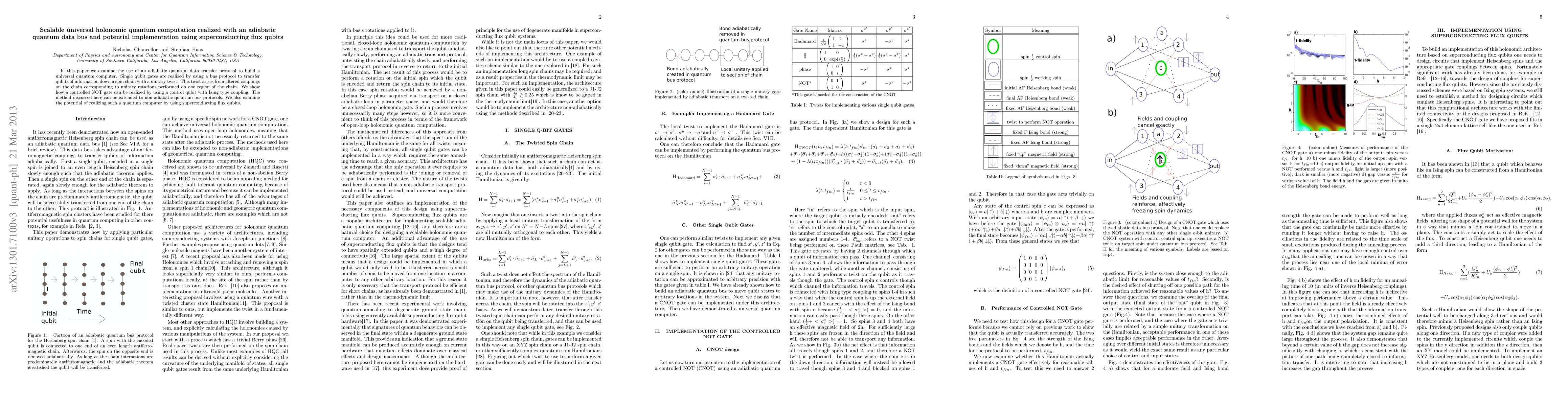 In this paper we examine the use of an adiabatic quantum data transfer protocol to build a universal quantum computer. Single qubit gates are realized by using a bus protocol to transfer qubits of information down a spin chain with a unitary twist. This twist arises from altered couplings on the chain corresponding to unitary rotations performed on one region of the chain. We show how a controlled NOT gate can be realized by using a control qubit with Ising type coupling. The method discussed here can be extended to non-adiabatic quantum bus protocols. We also examine the potential of realizing such a quantum computer by using superconducting flux qubits.