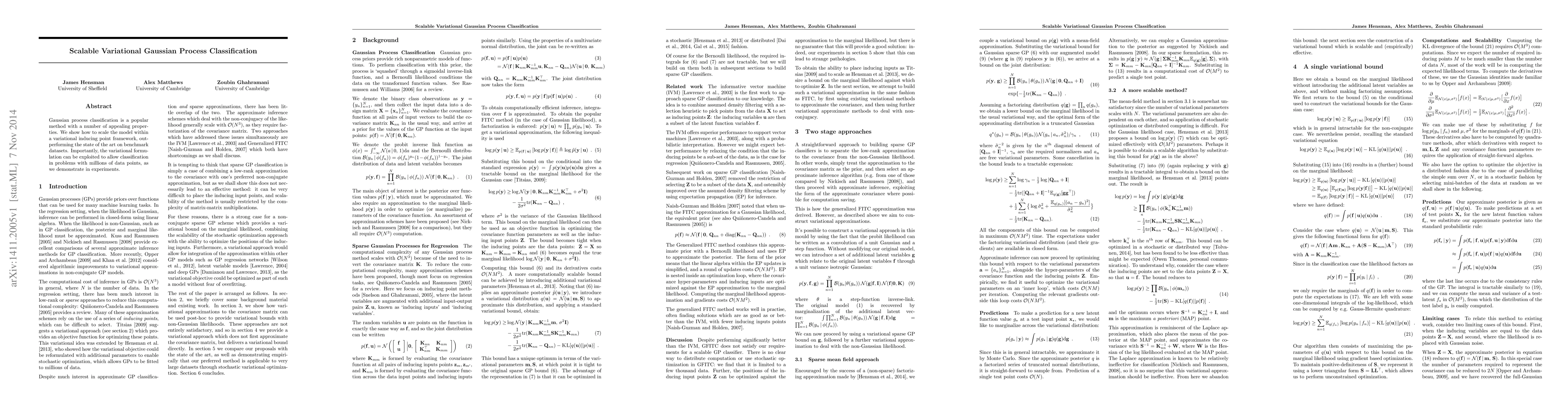This paper presents a scalable variational approach to Gaussian process classification, utilizing inducing points to enhance performance. The method outperforms existing techniques on benchmark datasets and can handle classification tasks with millions of data points.