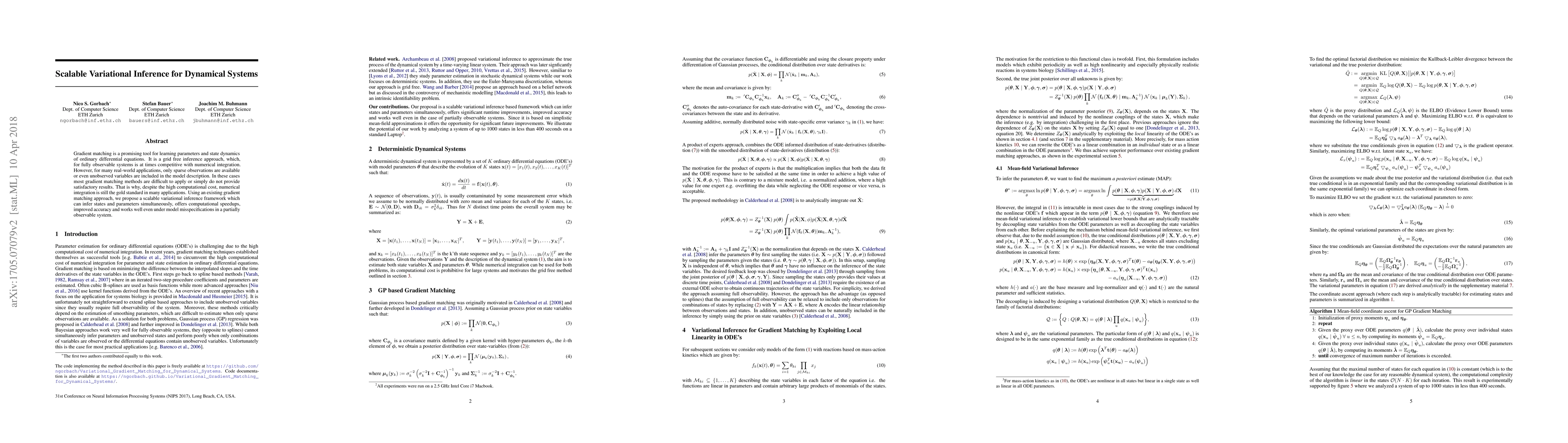 Gradient matching is a promising tool for learning parameters and state dynamics of ordinary differential equations. It is a grid free inference approach, which, for fully observable systems is at times competitive with numerical integration. However, for many real-world applications, only sparse observations are available or even unobserved variables are included in the model description. In these cases most gradient matching methods are difficult to apply or simply do not provide satisfactory results. That is why, despite the high computational cost, numerical integration is still the gold standard in many applications. Using an existing gradient matching approach, we propose a scalable variational inference framework which can infer states and parameters simultaneously, offers computational speedups, improved accuracy and works well even under model misspecifications in a partially observable system.