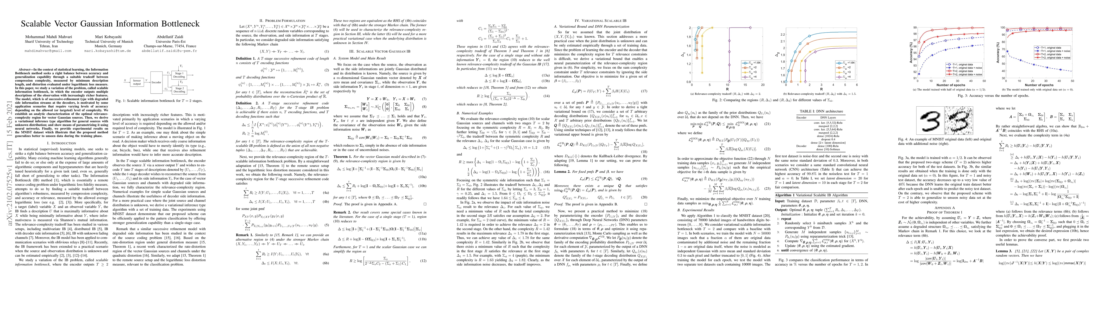 This paper proposes a scalable vector Gaussian Information Bottleneck method for balancing accuracy and generalization, introducing a successive-refinement encoder that outputs multiple descriptions. It establishes an optimal relevance-complexity region and provides a variational inference algorithm, demonstrating improved generalization on the MNIST dataset.