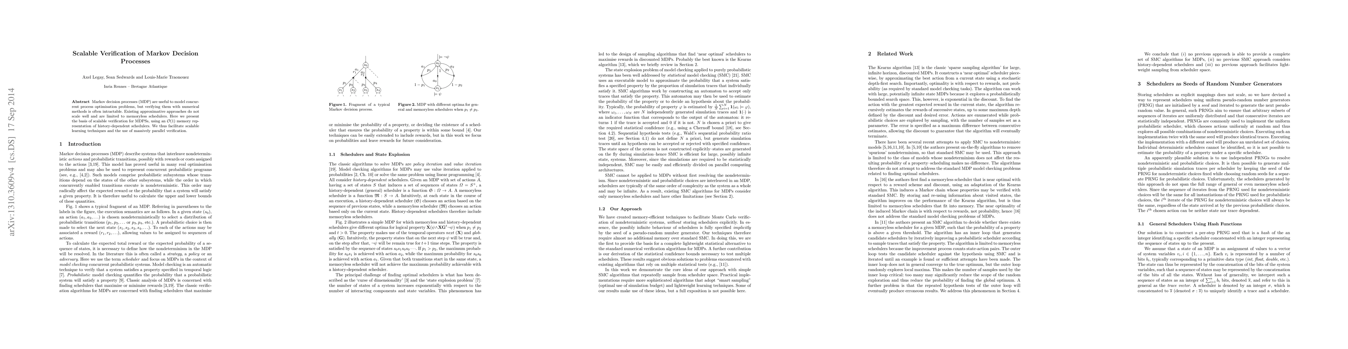 This paper introduces a scalable verification method for Markov decision processes (MDPs) using an O(1) memory representation for history-dependent schedulers, overcoming the limitations of existing approximative approaches that do not scale well. This facilitates scalable learning techniques and massively parallel verification.