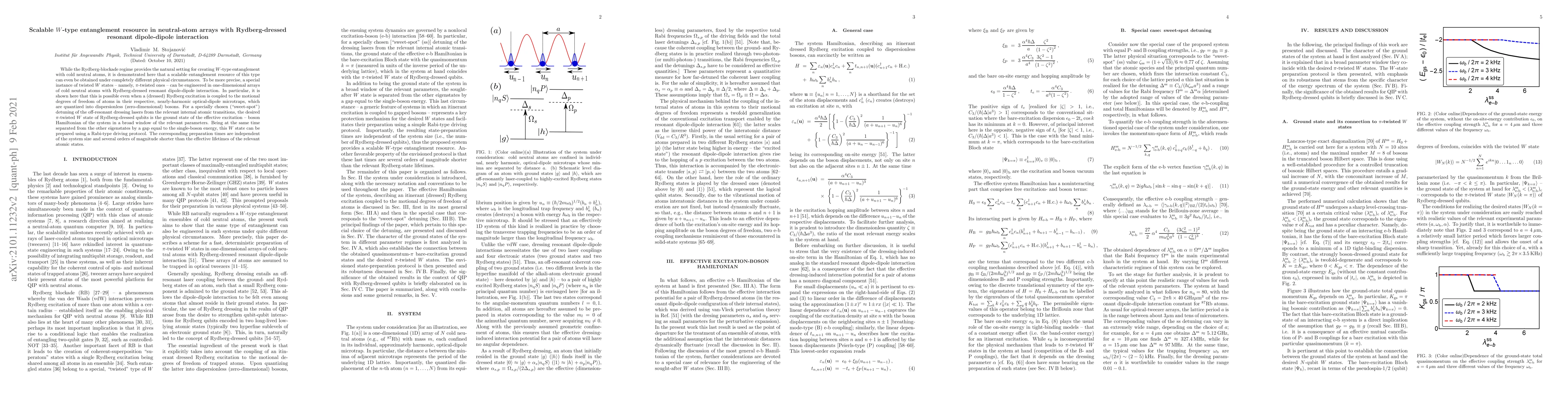 While the Rydberg-blockade regime provides the natural setting for creating $W$-type entanglement with cold neutral atoms, it is demonstrated here that a scalable entanglement resource of this type can even be obtained under completely different physical circumstances. To be more precise, a special instance of twisted $W$ states -- namely, $\pi$-twisted ones -- can be engineered in one-dimensional arrays of cold neutral atoms with Rydberg-dressed resonant dipole-dipole interaction. In particular, it is shown here that this is possible even when a (dressed) Rydberg excitation is coupled to the motional degrees of freedom of atoms in their respective, nearly-harmonic optical-dipole microtraps, which are quantized into dispersionless (zero-dimensional) bosons. For a specially chosen ("sweet-spot") detuning of the off-resonant dressing lasers from the relevant internal atomic transitions, the desired $\pi$-twisted $W$ state of Rydberg-dressed qubits is the ground state of the effective excitation -- boson Hamiltonian of the system in a broad window of the relevant parameters. Being at the same time separated from the other eigenstates by a gap equal to the single-boson energy, this $W$ state can be prepared using a Rabi-type driving protocol. The corresponding preparation times are independent of the system size and several orders of magnitude shorter than the effective lifetimes of the relevant atomic states.