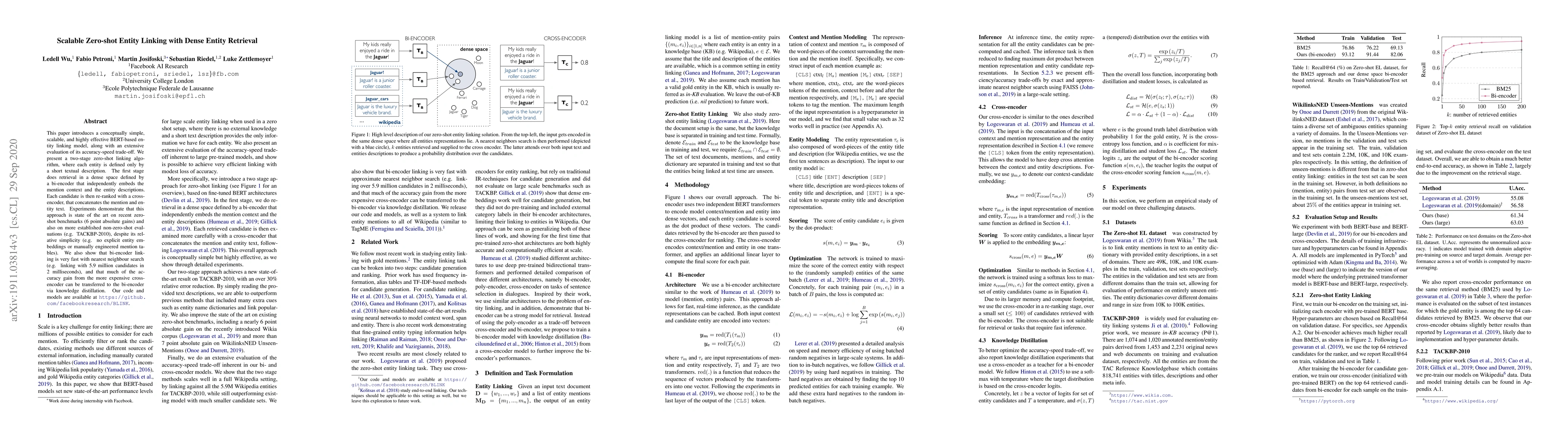 This paper proposes a scalable BERT-based zero-shot entity linking model using a bi-encoder for dense retrieval and a cross-encoder for re-ranking, achieving state-of-the-art results on benchmarks while maintaining speed and simplicity. The model demonstrates significant accuracy gains through knowledge distillation.