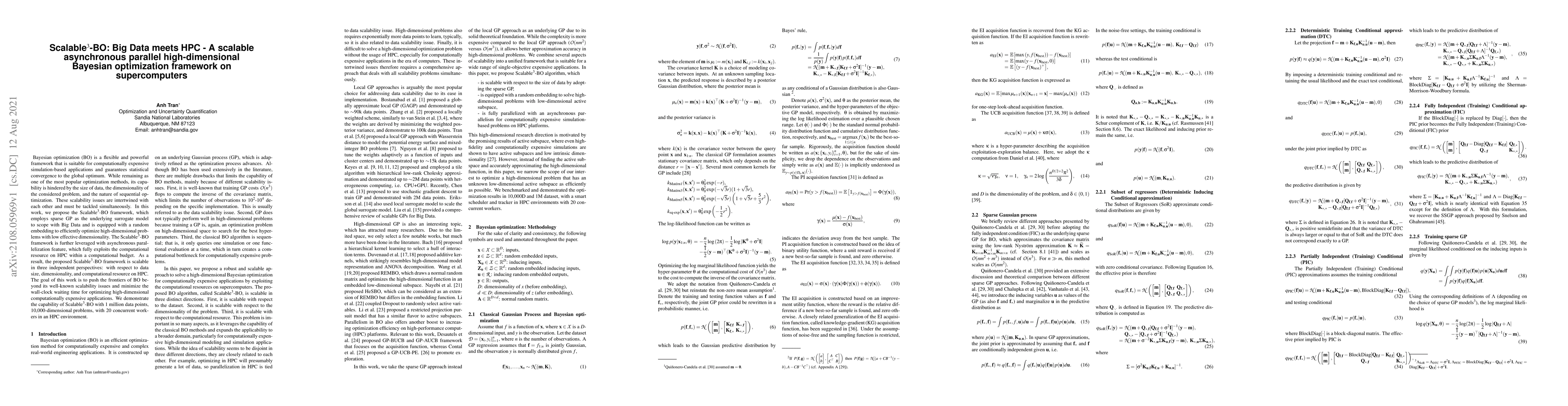 Scalable3-BO framework combines sparse Gaussian processes, random embeddings, and asynchronous parallelization to efficiently optimize computationally expensive applications on HPC platforms.