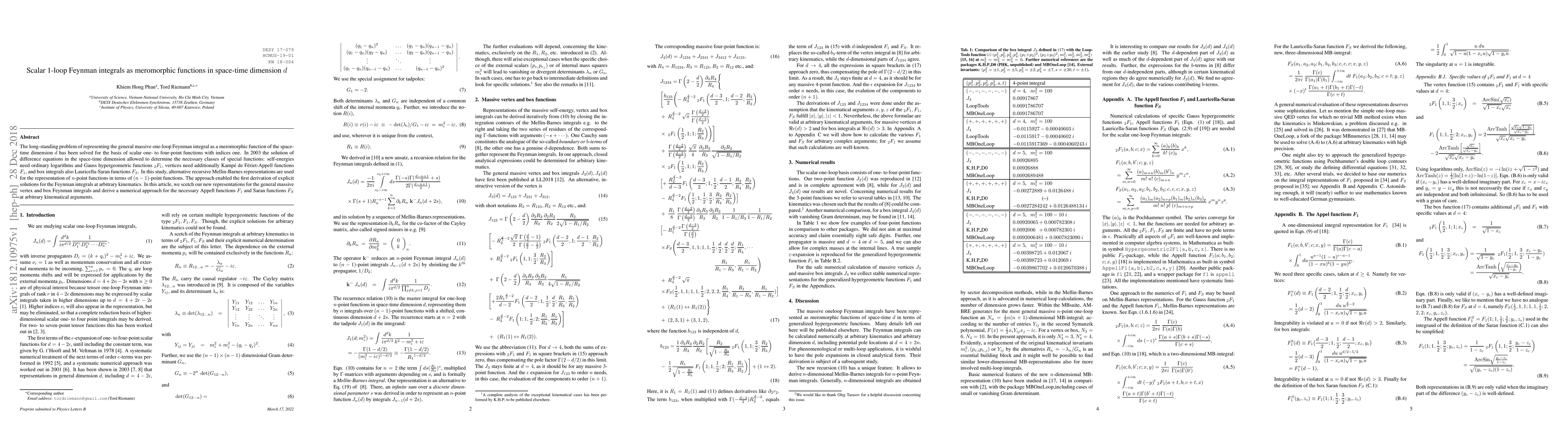 This paper solves the long-standing problem of representing scalar one-loop Feynman integrals as meromorphic functions in space-time dimension $d$, using recursive Mellin-Barnes representations and deriving explicit solutions for massive vertex and box integrals. It also introduces a numerical approach for Appell and Lauricella-Saran functions.