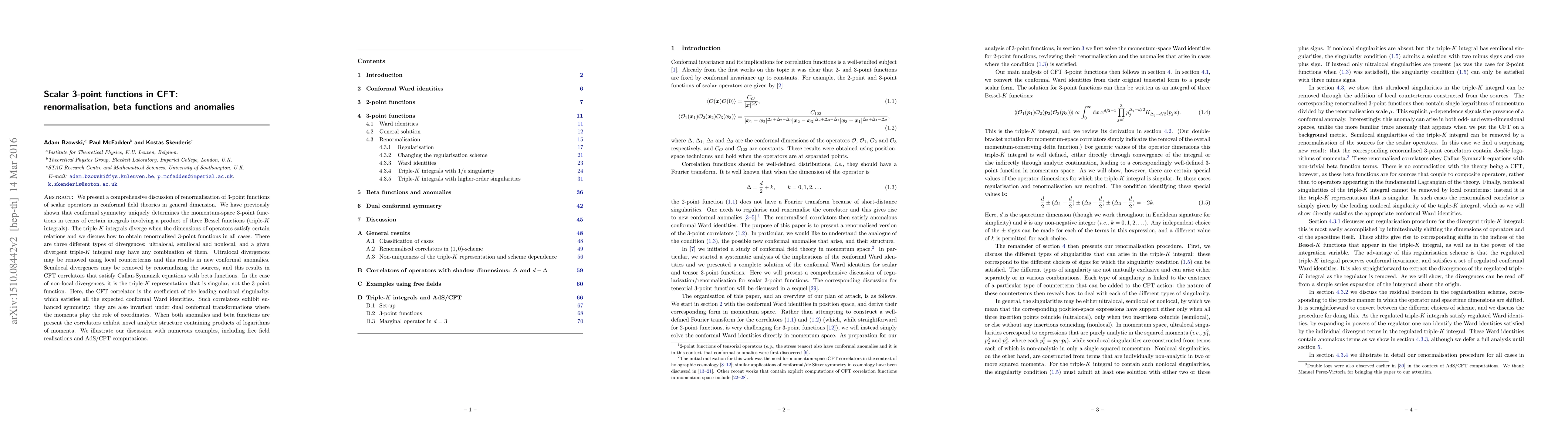 We present a comprehensive discussion of renormalisation of 3-point functions of scalar operators in conformal field theories in general dimension. We have previously shown that conformal symmetry uniquely determines the momentum-space 3-point functions in terms of certain integrals involving a product of three Bessel functions (triple-K integrals). The triple-K integrals diverge when the dimensions of operators satisfy certain relations and we discuss how to obtain renormalised 3-point functions in all cases. There are three different types of divergences: ultralocal, semilocal and nonlocal, and a given divergent triple-K integral may have any combination of them. Ultralocal divergences may be removed using local counterterms and this results in new conformal anomalies. Semilocal divergences may be removed by renormalising the sources, and this results in CFT correlators that satisfy Callan-Symanzik equations with beta functions. In the case of non-local divergences, it is the triple-K representation that is singular, not the 3-point function. Here, the CFT correlator is the coefficient of the leading nonlocal singularity, which satisfies all the expected conformal Ward identities. Such correlators exhibit enhanced symmetry: they are also invariant under dual conformal transformations where the momenta play the role of coordinates. When both anomalies and beta functions are present the correlators exhibit novel analytic structure containing products of logarithms of momenta. We illustrate our discussion with numerous examples, including free field realisations and AdS/CFT computations.
