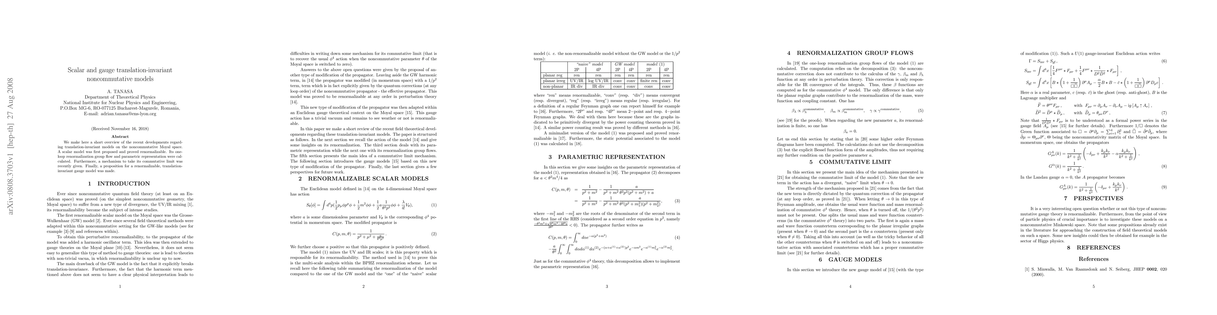 We make here a short overview of the recent developments regarding translation-invariant models on the noncommutative Moyal space. A scalar model was first proposed and proved renormalizable. Its one-loop renormalization group flow and parametric representation were calculated. Furthermore, a mechanism to take its commutative limit was recently given. Finally, a proposition for a renormalizable, translation-invariant gauge model was made.