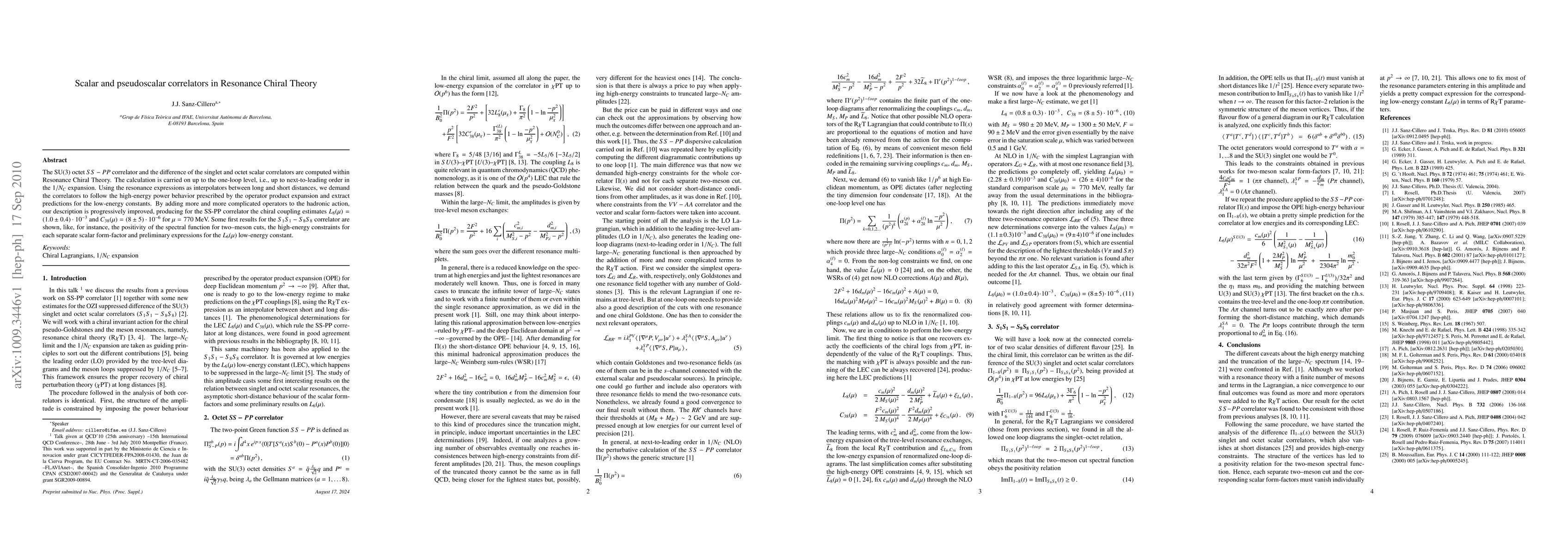 The SU(3) octet SS-PP correlator and the difference of the singlet and octet scalar correlators are computed within Resonance Chiral Theory. The calculation is carried on up to the one-loop level, i.e., up to next-to-leading order in the 1/Nc expansion. Using the resonance expressions as interpolators between long and short distances, we demand the correlators to follow the high-energy power behavior prescribed by the operator product expansion and extract predictions for the low-energy constants. By adding more and more complicated operators to the hadronic action, our description is progressively improved, producing for the SS-PP correlator the chiral coupling estimates L_8(mu) = (1.0+- 0.4) 10^{-3} and C_{38}(mu) = (8+- 5) 10^{-6} for mu=770 MeV. Some first results for the S1 S1 - S8 S8 correlator are shown, like, for instance, the positivity of the spectral function for two-meson cuts, the high-energy constraints for each separate scalar form-factor and preliminary expressions for the L_6(mu) low-energy constant.