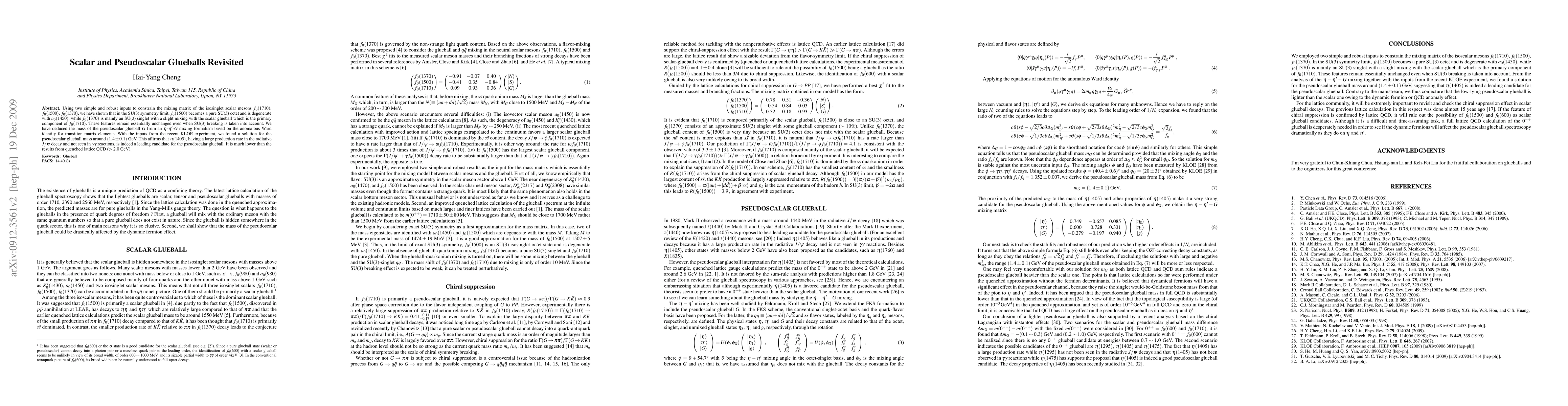 Using two simple and robust inputs to constrain the mixing matrix of the isosinglet scalar mesons $f_0(1710)$, $f_0(1500)$, $f_0(1370)$, we have shown that in the SU(3) symmetry limit, $f_0(1500)$ becomes a pure SU(3) octet and is degenerate with $a_0(1450)$, while $f_0(1370)$ is mainly an SU(3) singlet with a slight mixing with the scalar glueball which is the primary component of $f_0(1710)$. These features remain essentially unchanged even when SU(3) breaking is taken into account. We have deduced the mass of the pseudoscalar glueball $G$ from an $\eta$-$\eta'$-$G$ mixing formalism based on the anomalous Ward identity for transition matrix elements. With the inputs from the recent KLOE experiment, we find a solution for the pseudoscalar glueball mass around $(1.4\pm 0.1)$ GeV. This affirms that $\eta(1405)$, having a large production rate in the radiative $J/\psi$ decay and not seen in $\gamma\gamma$ reactions, is indeed a leading candidate for the pseudoscalar glueball. It is much lower than the results from quenched lattice QCD ($>2.0$ GeV).