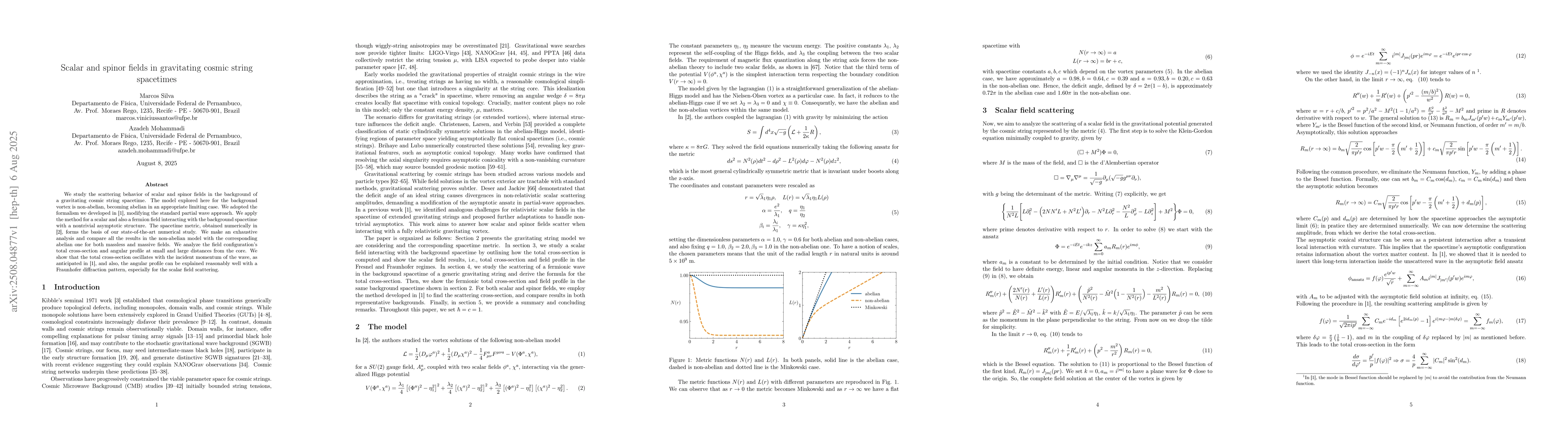 We study the scattering behavior of scalar and spinor fields in the background of a gravitating cosmic string spacetime. The model explored here for the background vortex is non-abelian, becoming abelian in an appropriate limiting case. We adopted the formalism we developed in \cite{silva2021scattering}, modifying the standard partial wave approach. We apply the method for a scalar and also a fermion field interacting with the background spacetime with a nontrivial asymptotic structure. The spacetime metric, obtained numerically in \cite{de2015gravitating}, forms the basis of our state-of-the-art numerical study. We make an exhaustive analysis and compare all the results in the non-abelian model with the corresponding abelian one for both massless and massive fields. We analyze the field configuration's total cross-section and angular profile at small and large distances from the core. We show that the total cross-section oscillates with the incident momentum of the wave, as anticipated in \cite{silva2021scattering}, and also, the angular profile can be explained reasonably well with a Fraunhofer diffraction pattern, especially for the scalar field scattering.