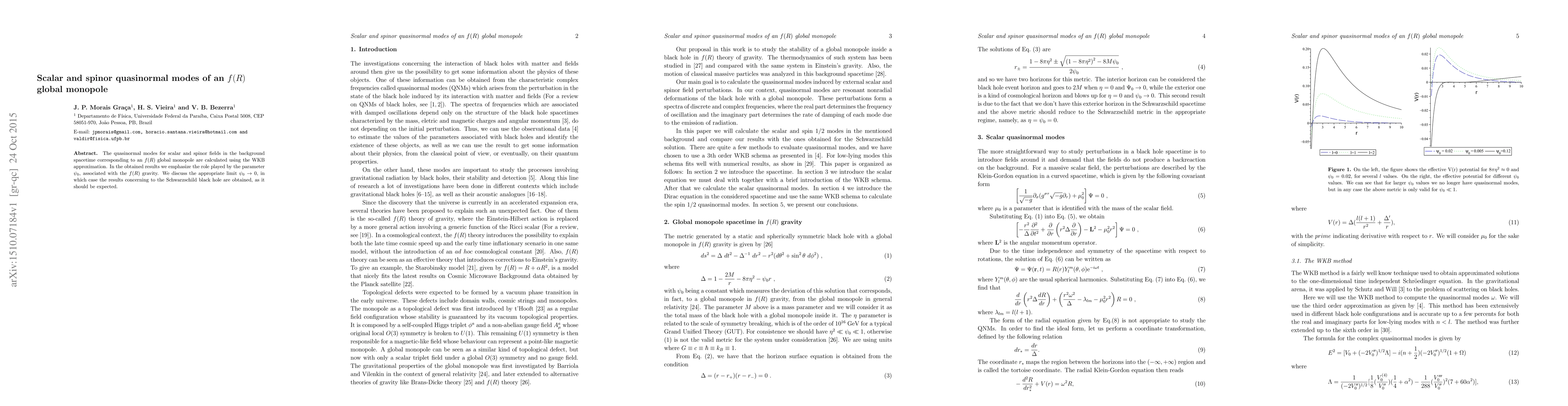 This paper calculates the quasinormal modes for scalar and spinor fields in the spacetime of an $f(R)$ global monopole using the WKB approximation, highlighting the influence of the parameter $\psi_{0}$ in $f(R)$ gravity. It also discusses the limit where $\psi_{0} \rightarrow 0$, recovering results for the Schwarzschild black hole.