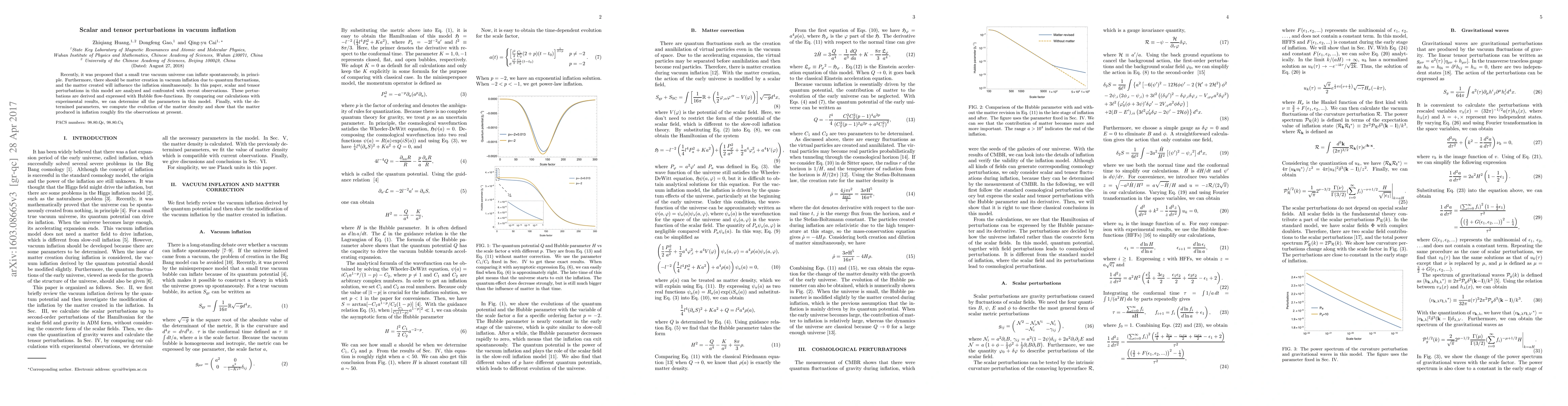 Recently, it was proposed that a small true vacuum universe can inflate spontaneously, in principle. Furthermore, there should be matter creation in vacuum inflation due to quantum fluctuations, and the matter created will influence the inflation simultaneously. In this paper, scalar and tensor perturbations in this model are analyzed and confronted with recent observations. These perturbations are derived and expressed with Hubble flow-functions. By comparing our calculations with experimental results, we can determine all the parameters in this model. Finally, with the determined parameters, we compute the evolution of the matter density and show that the matter produced in inflation roughly fits the observations at present.