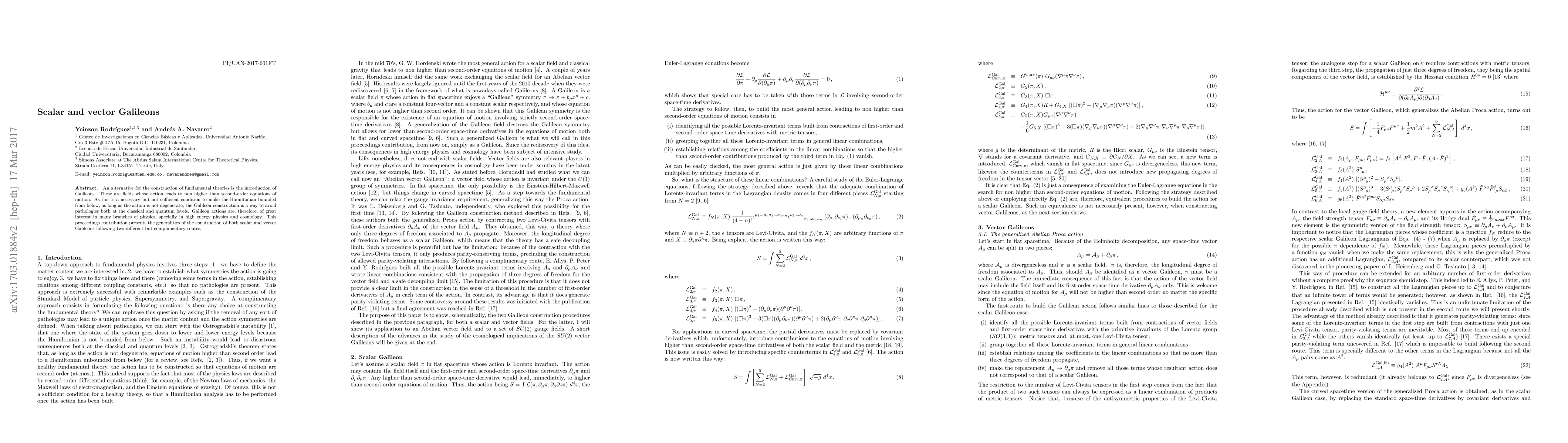 This paper explores the construction of scalar and vector Galileons, which lead to non-higher-than-second-order equations of motion, avoiding classical and quantum pathologies. It presents two complementary approaches to their construction, highlighting their significance in high-energy physics and cosmology.