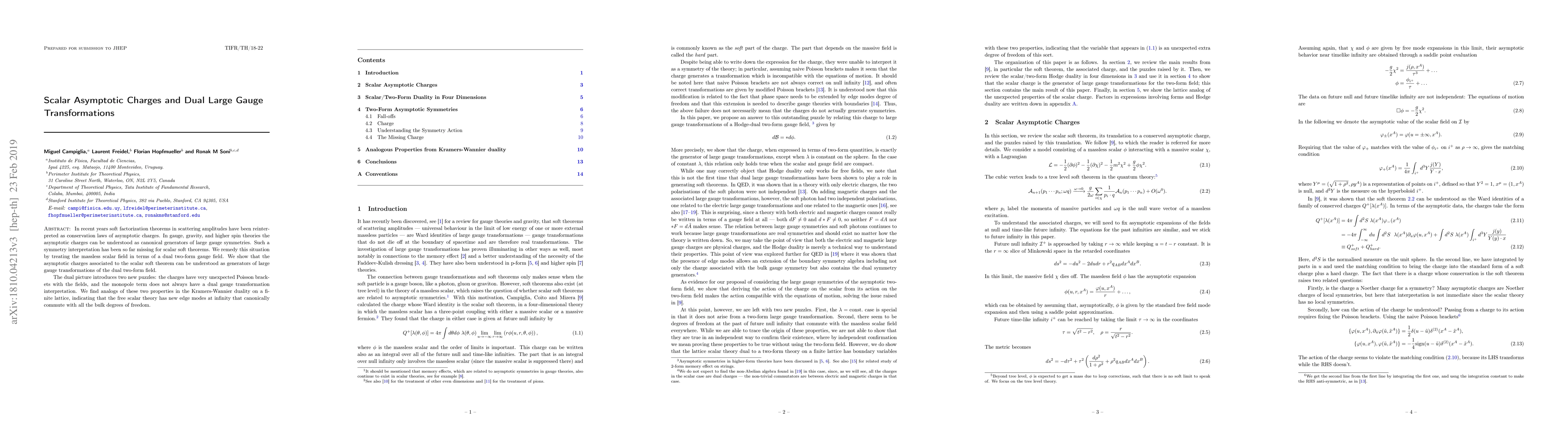 This paper reinterprets scalar soft theorems as conservation laws of asymptotic charges, revealing that these charges are generators of large gauge transformations in the dual two-form gauge field. It also identifies unexpected Poisson brackets and the absence of dual gauge transformation for the monopole term, drawing parallels to Kramers-Wannier duality to suggest new edge modes at infinity.