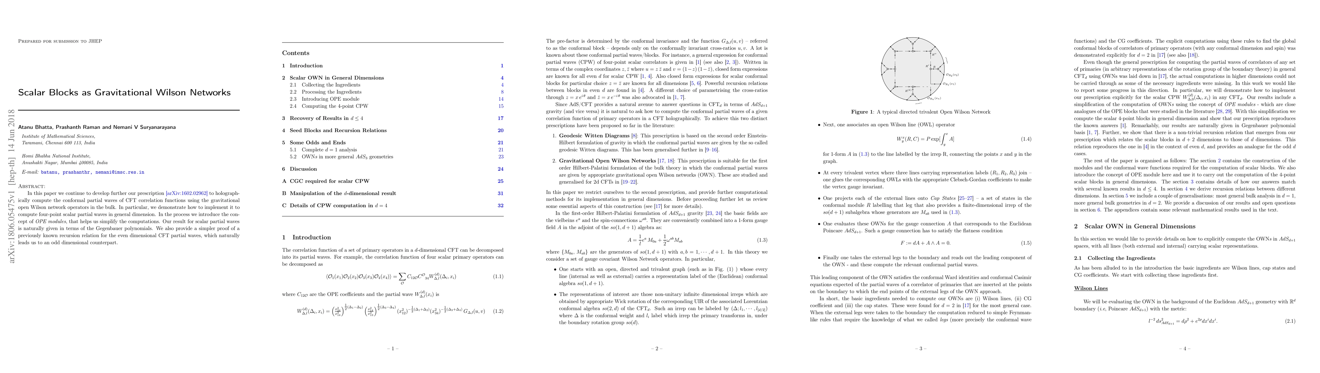 In this paper we continue to develop further our prescription [arXiv:1602.02962] to holographically compute the conformal partial waves of CFT correlation functions using the gravitational open Wilson network operators in the bulk. In particular, we demonstrate how to implement it to compute four-point scalar partial waves in general dimension. In the process we introduce the concept of OPE modules, that helps us simplify the computations. Our result for scalar partial waves is naturally given in terms of the Gegenbauer polynomials. We also provide a simpler proof of a previously known recursion relation for the even dimensional CFT partial waves, which naturally leads us to an odd dimensional counterpart.