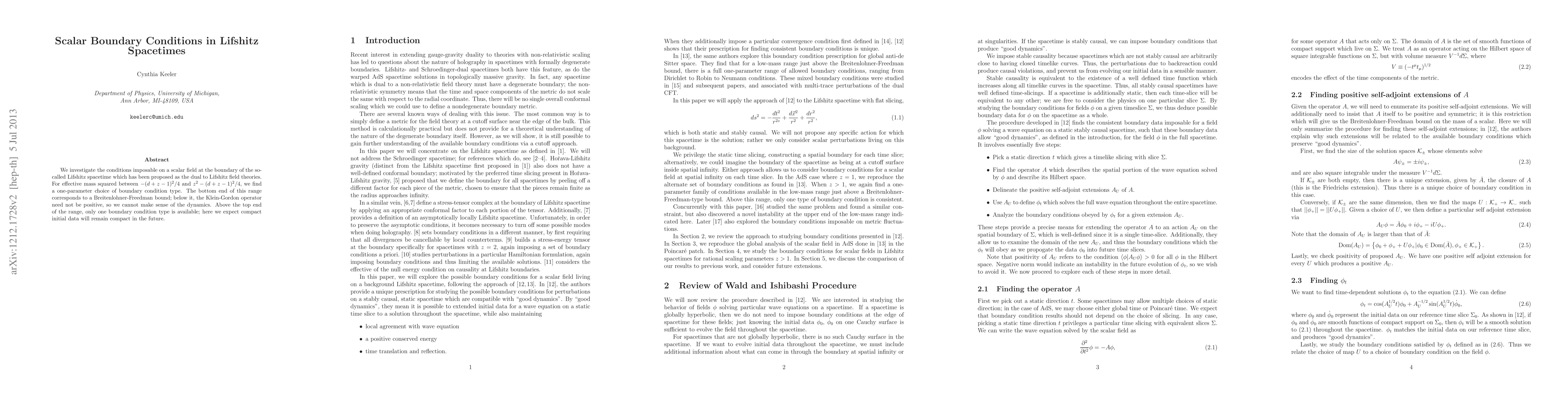 Researchers investigated boundary conditions for a scalar field in Lifshitz spacetimes, finding that effective mass squared ranges have different types of boundary conditions, with one range allowing only one type of condition above the top end.
