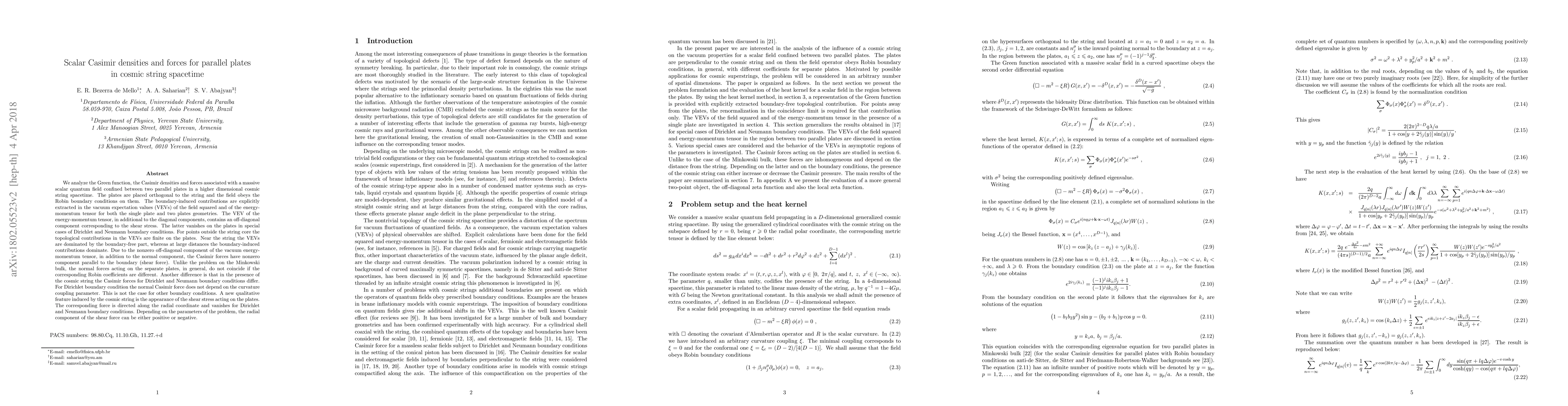 We analyze the Casimir densities and forces associated with a massive scalar quantum field confined between two parallel plates in a D-dimensional cosmic string spacetime. The plates are placed orthogonal to the string and the field obeys the Robin boundary conditions on them. The boundary-induced contributions are explicitly extracted in the vacuum expectation values (VEVs) of the field squared and energy-momentum tensor for both single and two plates. The VEV of the energy-momentum tensor, in additional to the diagonal components, contains an off-diagonal component corresponding to the shear stress. The latter vanishes on the plates in special cases of Dirichlet and Neumann boundary conditions. For points outside the string core the topological contributions in the VEVs are finite on the plates. Near the string the VEVs are dominated by the boundary-free part, whereas at large distances the boundary-induced contributions dominate. Due to the nonzero off-diagonal component of the vacuum energy-momentum tensor, in addition to the normal component, the Casimir forces have nonzero component parallel to the boundary. Unlike the problem on the Minkowski bulk, the normal forces acting on the separate plates, in general, do not coincide. Another difference is that in the presence of the cosmic string the Casimir forces for Dirichlet and Neumann boundary conditions differ. For Dirichlet case the normal Casimir force does not depend on the curvature coupling parameter. This is not the case for other boundary conditions. A new qualitative feature induced by the cosmic string is the appearance of the shear stress acting on the plates. The corresponding force is directed along the radial coordinate and vanishes for Dirichlet and Neumann cases. Depending on the parameters of the problem, the radial component of the shear force can be either positive or negative.
