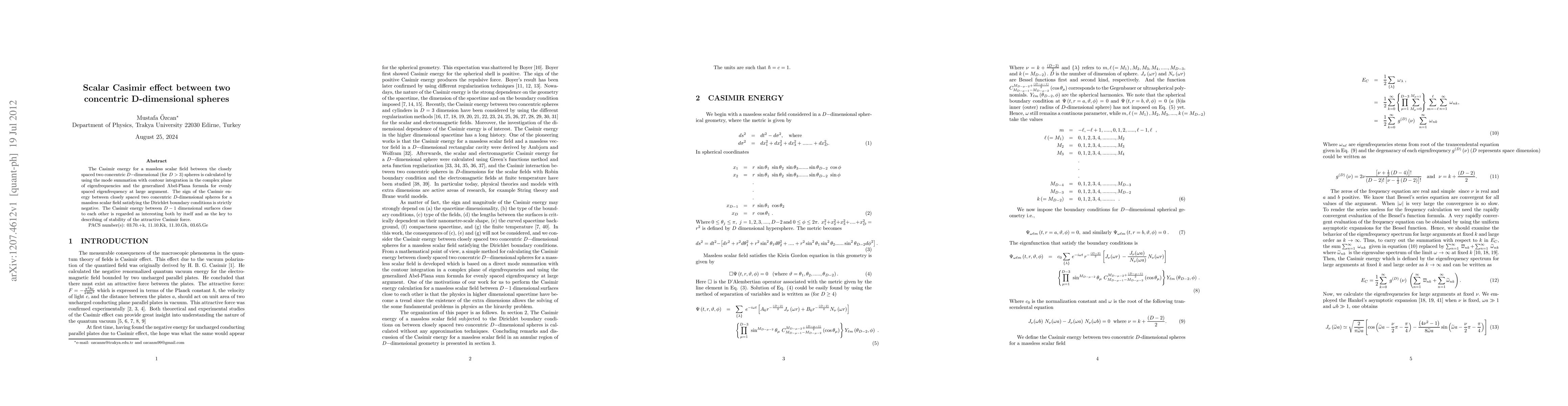 This paper calculates the scalar Casimir energy between two closely spaced, concentric D-dimensional spheres (D>3) using mode summation and contour integration, revealing a strictly negative energy under Dirichlet boundary conditions. The findings are significant for understanding the stability of the Casimir force.