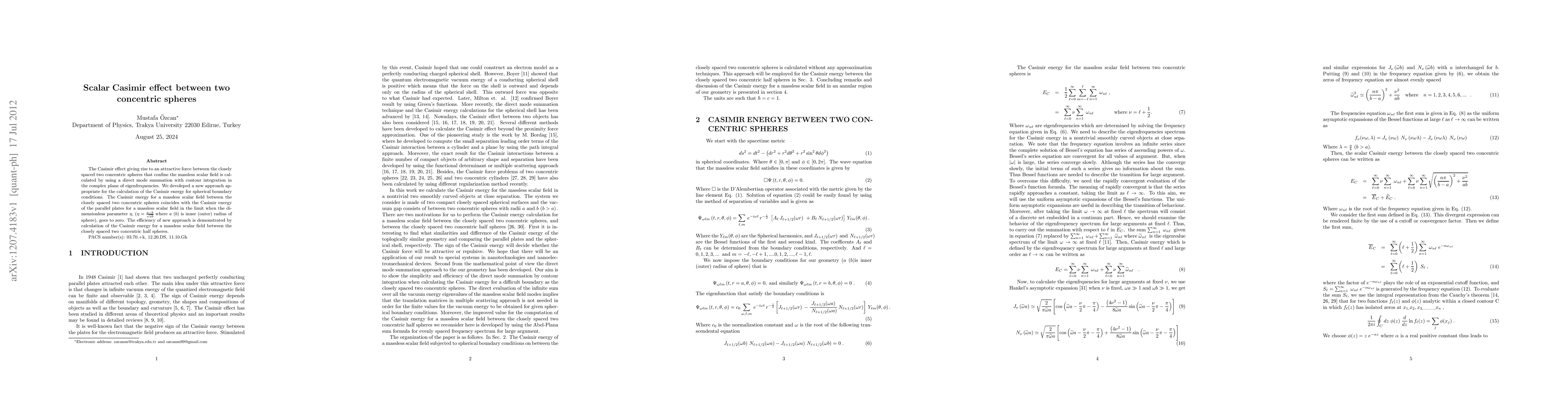 This paper calculates the scalar Casimir effect between two concentric spheres using a novel mode summation method with contour integration. It demonstrates that the Casimir energy for closely spaced spheres converges to that of parallel plates as the separation approaches zero.