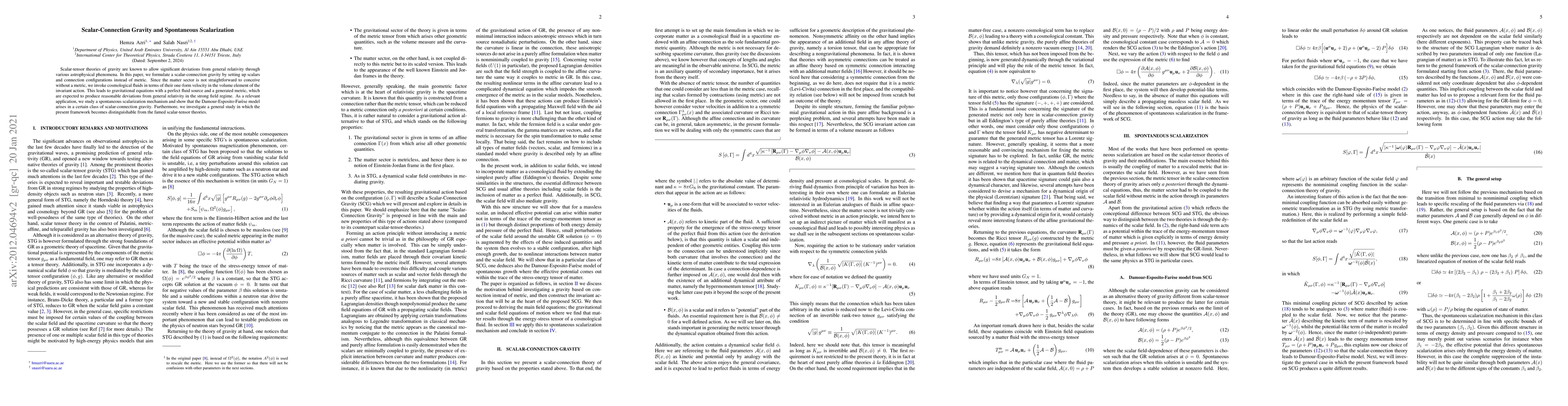 Scalar-tensor theories of gravity are known to allow significant deviations from general relativity through various astrophysical phenomena. In this paper, we formulate a scalar-connection gravity by setting up scalars and connection configurations instead of metric. Since the matter sector is not straightforward to conceive without a metric, we invoke cosmological fluids in terms of their one-form velocity in the volume element of the invariant action. This leads to gravitational equations with a perfect fluid source and a generated metric, which are expected to produce reasonable deviations from general relativity in the strong-field regime. As a relevant application, we study spontaneous scalarization mechanism and show that the Damour-Esposito-Far\`{e}se model arises in a certain class of scalar-connection gravity. Furthermore, we investigate a general study in which the present framework becomes distinguishable from the famed scalar-tensor theories.