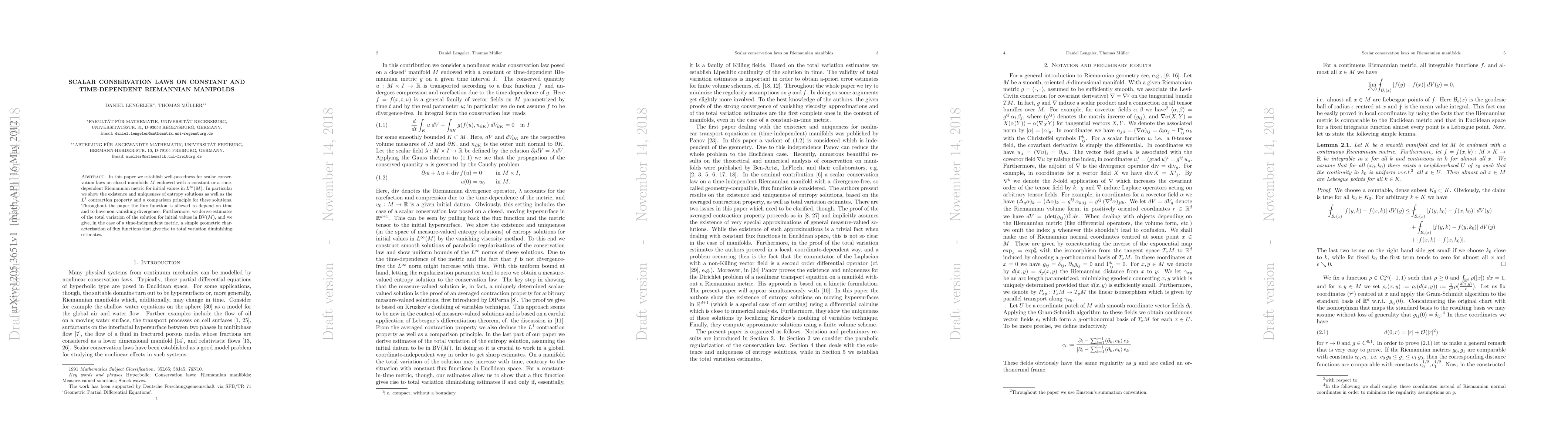 In this paper we establish well-posedness for scalar conservation laws on closed manifolds M endowed with a constant or a time-dependent Riemannian metric for initial values in L^\infty(M). In particular we show the existence and uniqueness of entropy solutions as well as the L^1 contraction property and a comparison principle for these solutions. Throughout the paper the flux function is allowed to depend on time and to have non-vanishing divergence. Furthermore, we derive estimates of the total variation of the solution for initial values in BV(M), and we give, in the case of a time-independent metric, a simple geometric characterisation of flux functions that give rise to total variation diminishing estimates.