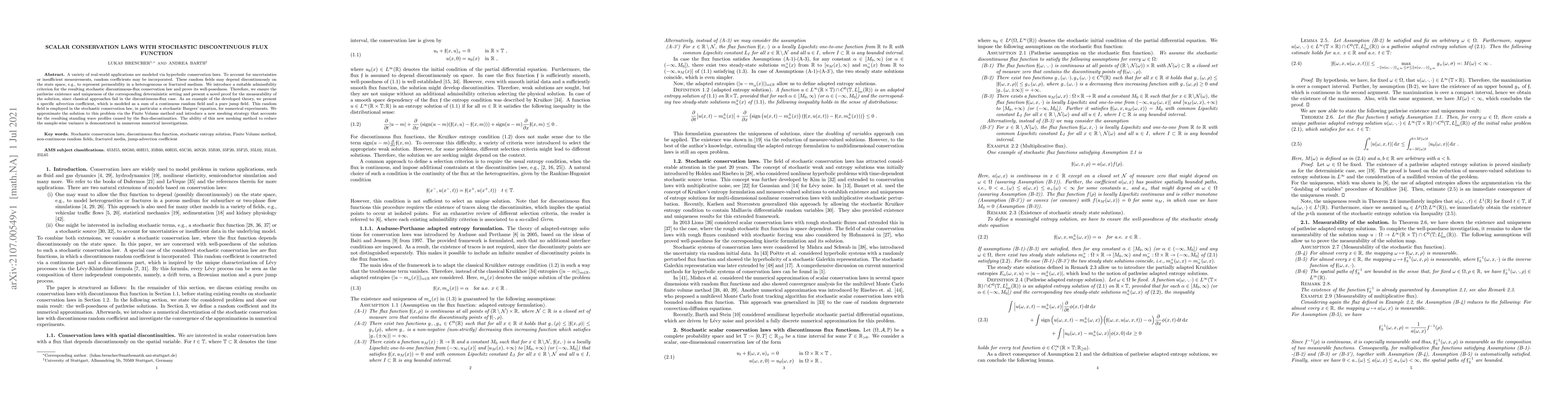 This paper introduces a stochastic conservation law with a discontinuous flux function, proving its well-posedness and measurability of solutions. It also presents a new meshing strategy for Finite Volume method approximations, which effectively reduces sample-wise variance in numerical experiments.