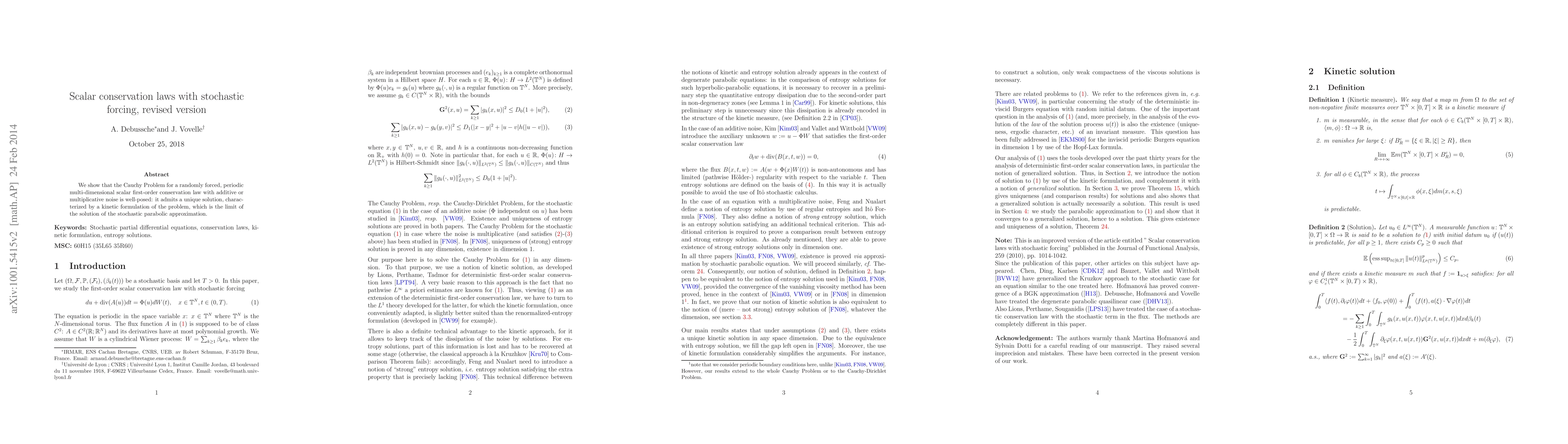 The paper demonstrates the well-posedness of the Cauchy Problem for a randomly forced, periodic multi-dimensional scalar conservation law, proving the existence of a unique solution characterized by a kinetic formulation, which converges to the stochastic parabolic approximation.