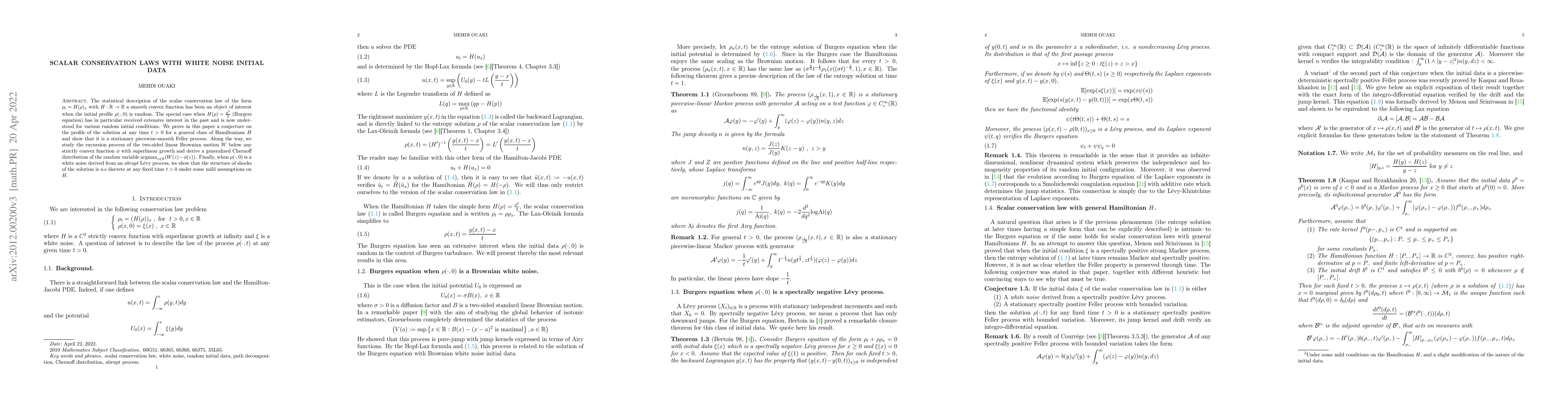 The statistical description of the scalar conservation law of the form $\rho_t=H(\rho)_x$ with $H: \mathbb{R} \rightarrow \mathbb{R}$ a smooth convex function has been an object of interest when the initial profile $\rho(\cdot,0)$ is random. The special case when $H(\rho)=\frac{\rho^2}{2}$ (Burgers equation) has in particular received extensive interest in the past and is now understood for various random initial conditions. We solve in this paper a conjecture on the profile of the solution at any time $t>0$ for a general class of hamiltonians $H$ and show that it is a stationary piecewise-smooth Feller process. Along the way, we study the excursion process of the two-sided linear Brownian motion $W$ below any strictly convex function $\phi$ with superlinear growth and derive a generalized Chernoff distribution of the random variable $\text{argmax}_{z \in \mathbb{R}} (W(z)-\phi(z))$. Finally, when $\rho(\cdot,0)$ is a white noise derived from an abrupt L\'evy process, we show that the shocks structure of the solution is a.s discrete at any fixed time $t>0$ under some mild assumptions on $H$.