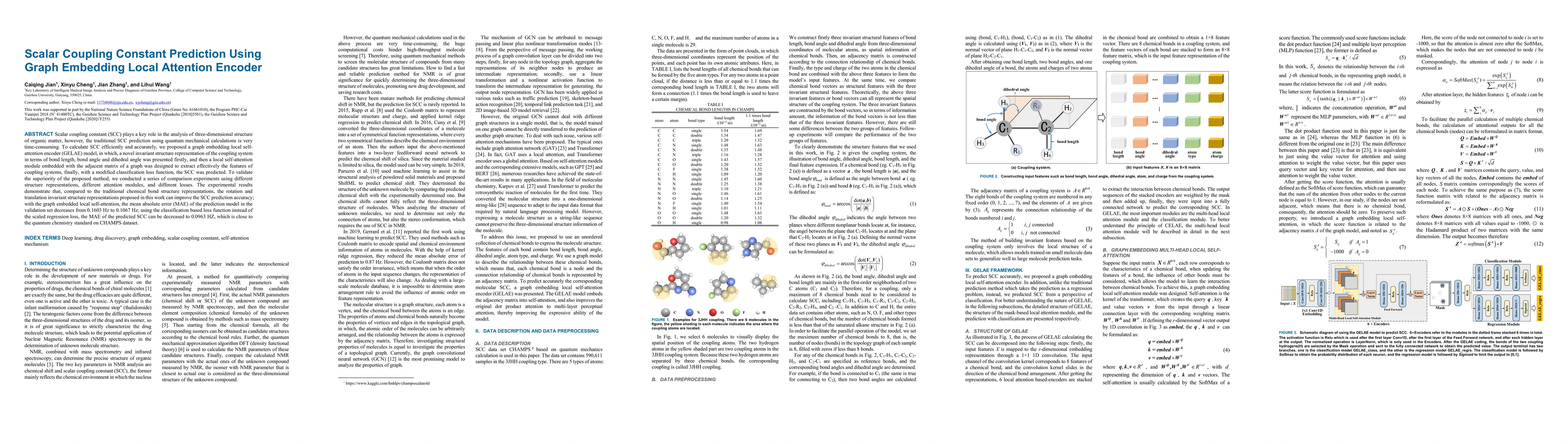 This paper proposes a graph embedding local self-attention encoder (GELAE) model to efficiently predict scalar coupling constants (SCC), which are crucial for analyzing the 3D structure of organic molecules. The model uses invariant structure representations and a local self-attention mechanism to enhance feature extraction, achieving a significant reduction in mean absolute error compared to traditional methods.