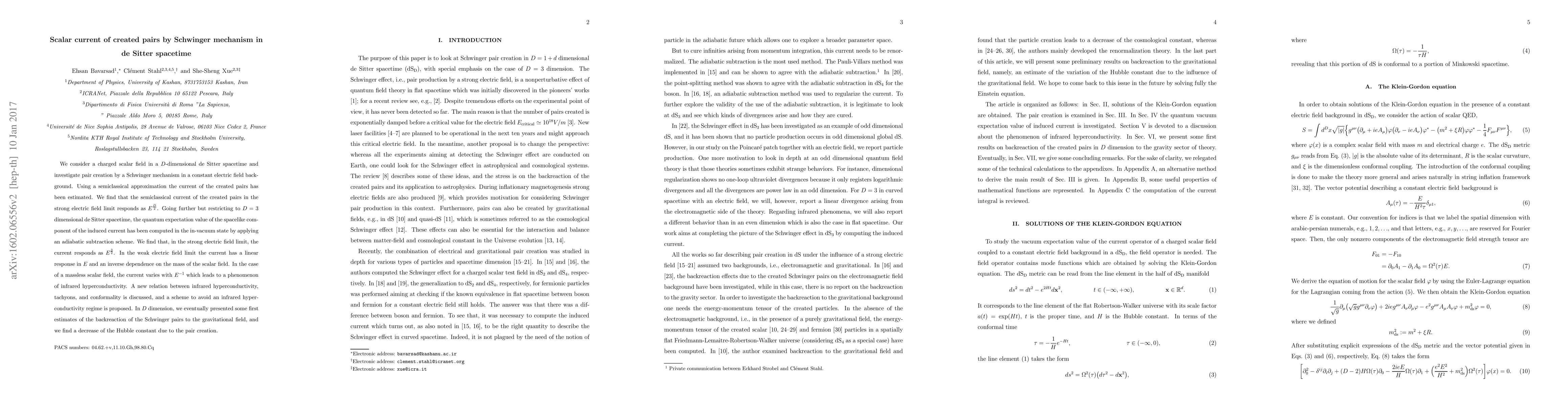 This paper explores the pair creation of charged scalar fields via the Schwinger mechanism in de Sitter spacetime under a constant electric field. It estimates the current of created pairs, finding a strong electric field dependence of $E^{\frac{D}{2}}$, and discusses infrared hyperconductivity in the weak field limit, proposing a method to avoid this regime.