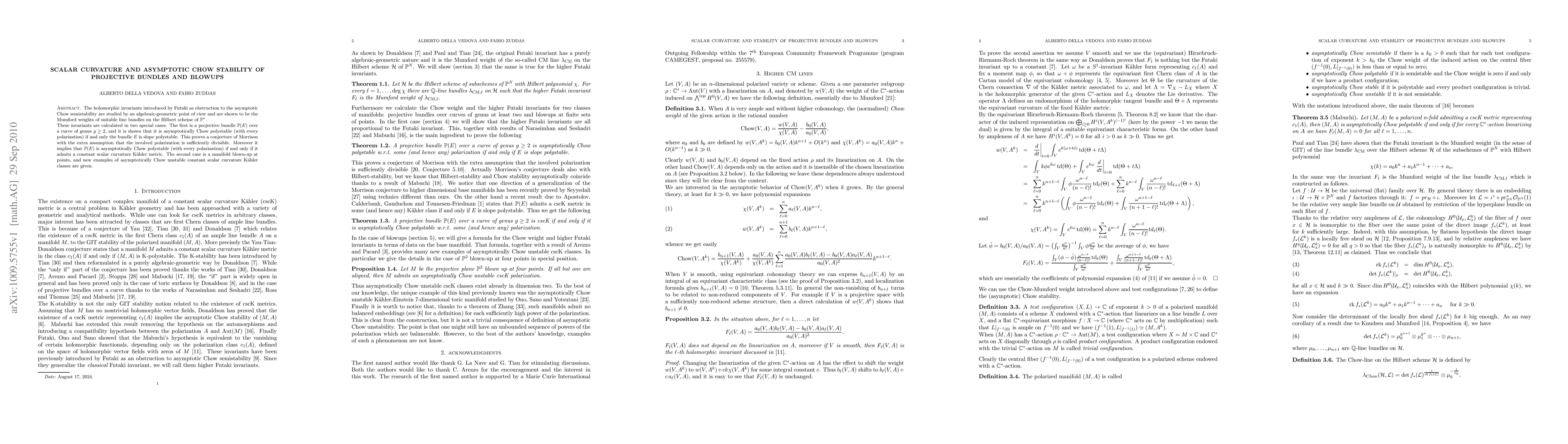 The holomorphic invariants introduced by Futaki as obstruction to the asymptotic Chow semistability are studied by an algebraic-geometric point of view and are shown to be the Mumford weights of suitable line bundles on the Hilbert scheme. These invariants are calculated in two special cases. The first is a projective bundle over a curve of genus at least two, and it is shown that it is asymptotically Chow polystable (with every polarization) if and only the underlying vector bundle is slope polystable. This proves a conjecture of Morrison with the extra assumption that the involved polarization is sufficiently divisible. Moreover it implies that a projective bundle is asymptotically Chow polystable (with every polarization) if and only if it admits a constant scalar curvature Kaehler metric. The second case is a manifold blown-up at points, and new examples of asymptotically Chow unstable constant scalar curvature Kaehler classes are given.