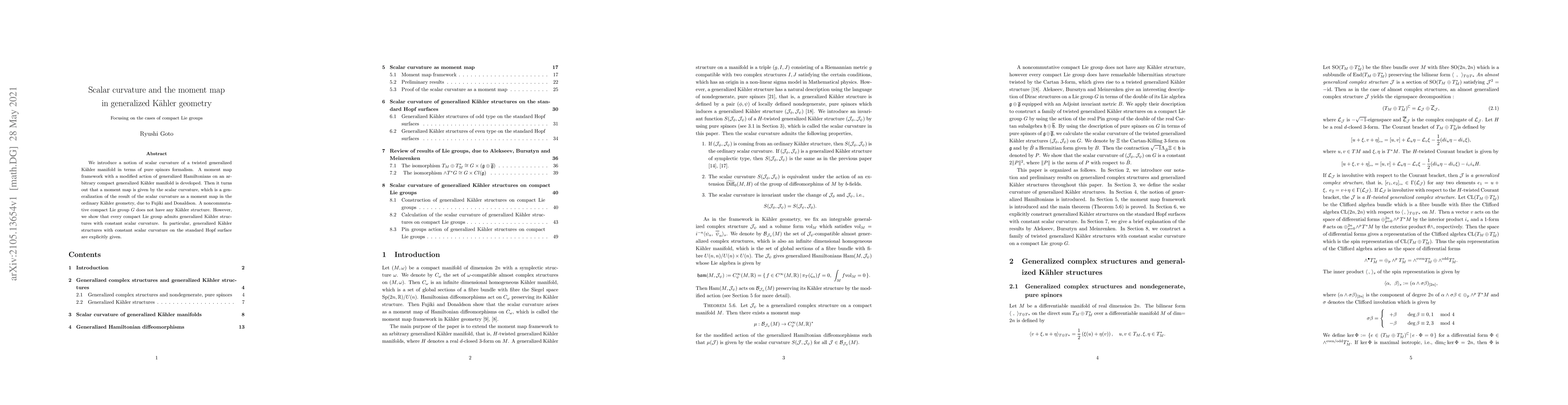 We introduce a notion of scalar curvature of a twisted generalized Kahler manifold in terms of pure spinors formalism. A moment map framework with a modified action of generalized Hamiltonians on an arbitrary compact generalized Kahler manifold is developed. Then it turns out that a moment map is given by the scalar curvature, which is a generalization of the result of the scalar curvature as a moment map in the ordinary Kahler geometry, due to Fujiki and Donaldson. A noncommutative compact Lie group $G$ does not have any Kahler structure. However, we show that every compact Lie group admits generalized Kahler structures with constant scalar curvature. In particular, generalized Kahler structures with constant scalar curvature on the standard Hopf surface are explicitly given.