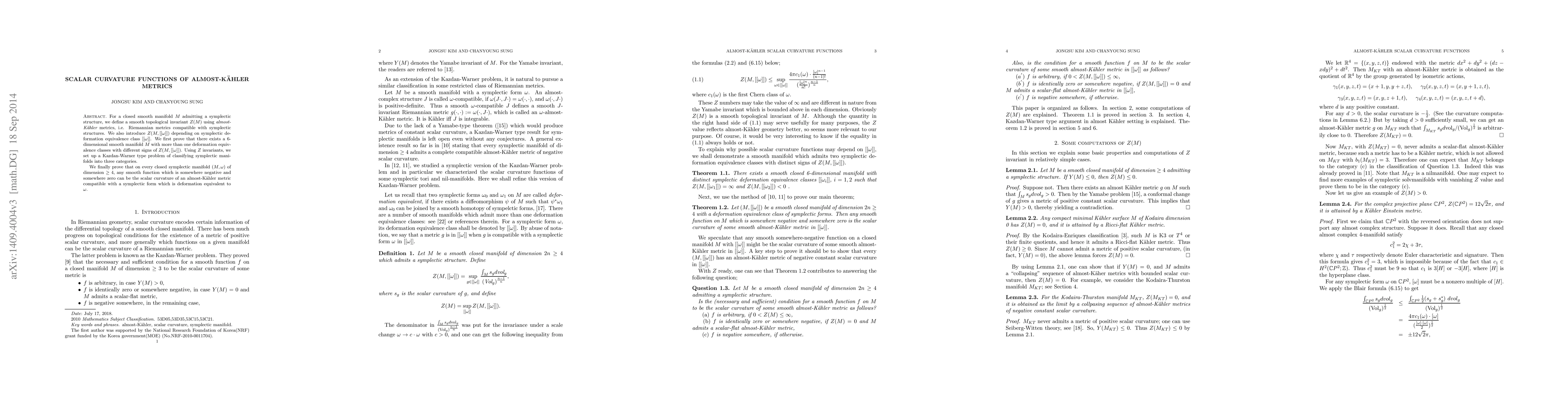 For a closed smooth manifold $M$ admitting a symplectic structure, we define a smooth topological invariant $Z(M)$ using almost-K\"ahler metrics, i.e. Riemannian metrics compatible with symplectic structures. We also introduce $Z(M, [[\omega]])$ depending on symplectic deformation equivalence class $[[\omega]]$. We first prove that there exists a 6-dimensional smooth manifold $M$ with more than one deformation equivalence classes with different signs of $Z(M, [[\omega]] )$. Using $Z$ invariants, we set up a Kazdan-Warner type problem of classifying symplectic manifolds into three categories. We finally prove that on every closed symplectic manifold $(M, \omega)$ of dimension $\geq 4$, any smooth function which is somewhere negative and somewhere zero can be the scalar curvature of an almost-K\"ahler metric compatible with a symplectic form which is deformation equivalent to $\omega$.
